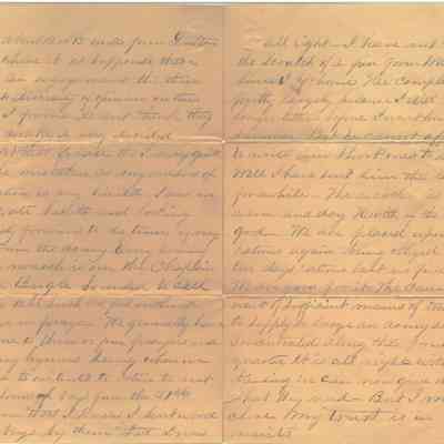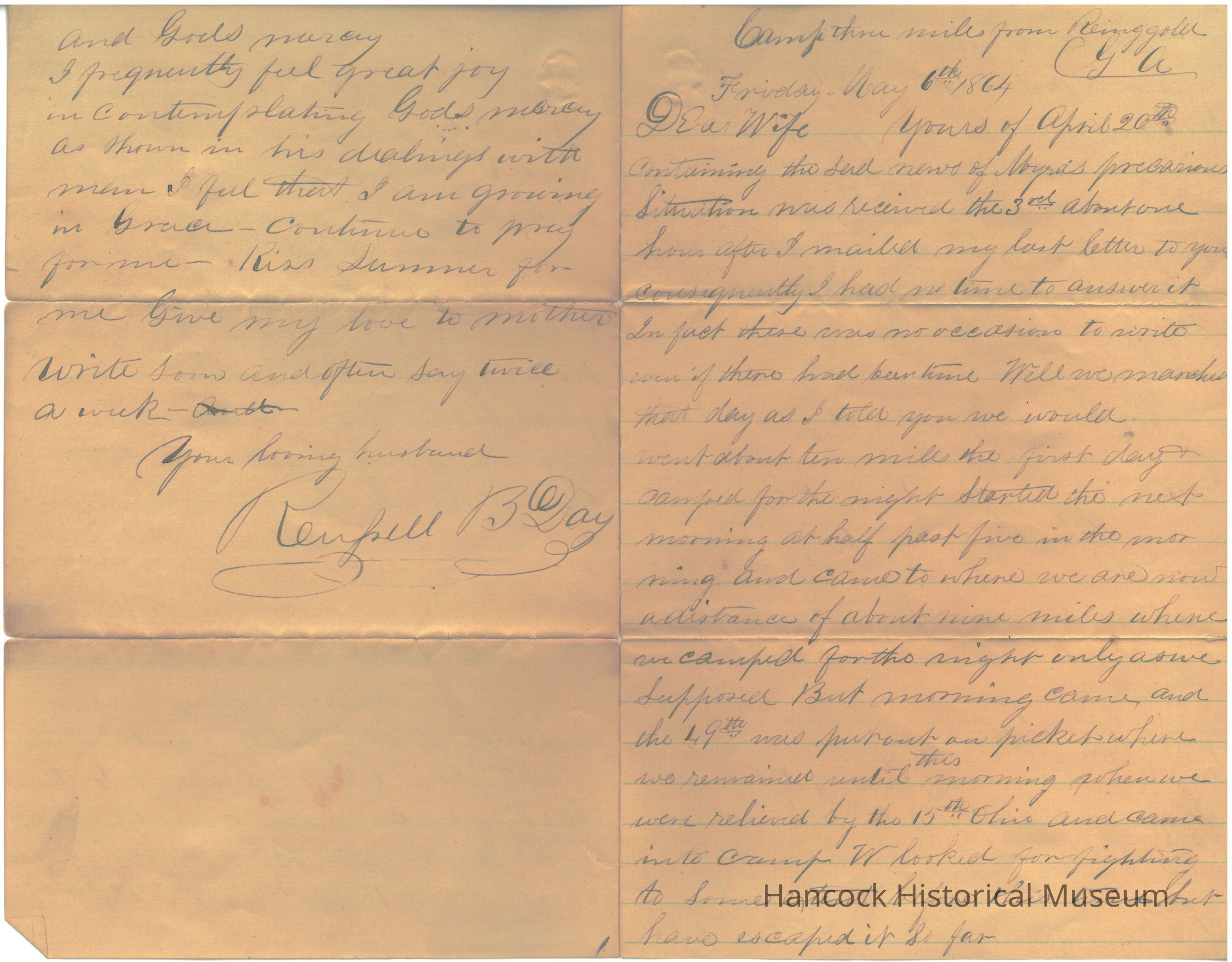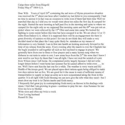 The image displays a handwritten letter, dated Thursday, May 4th, 1864, from a camp three miles from Ringgold, Georgia. The letter begins with an address to "Dear Wife" and discusses recent events, including the receipt of the wife's letter and an account of military movements. The writer describes marching, camping, and duties, mentioning interactions with different regiments and picket duties. The author reflects on faith, requests prayers, and expresses personal feelings, conveying love and asking for continued correspondence. The letter closes with a warm farewell, signed by “Russell B Day.” The document shows signs of age with yellowed paper and delicate handwriting.