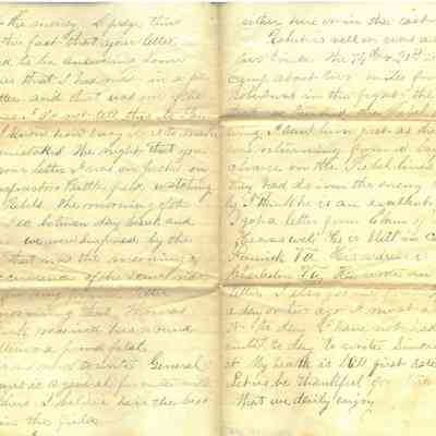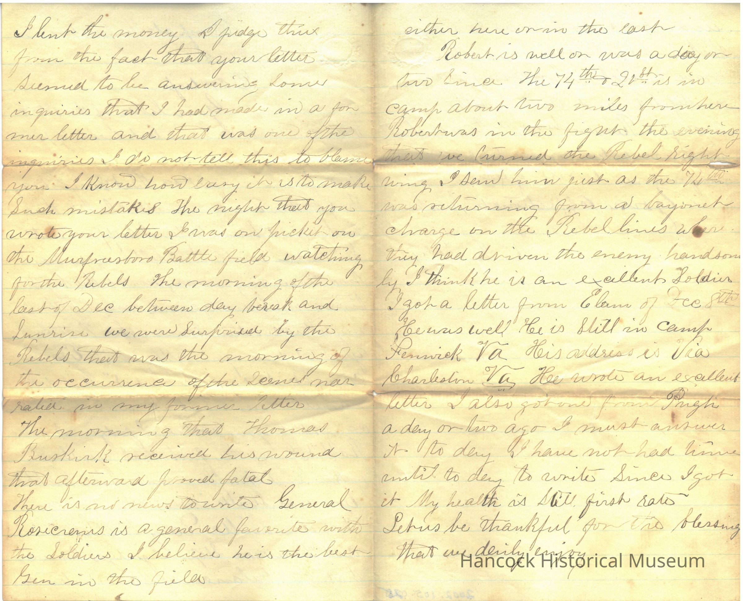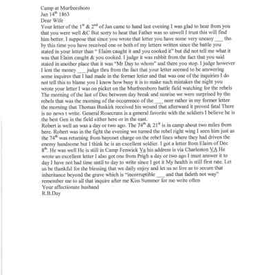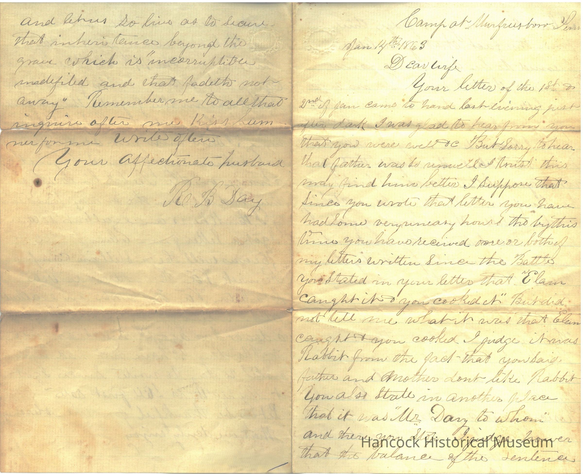 The image displays an aged, handwritten letter on yellowed paper with folds, indicative of frequent handling or storage. The text is written in cursive, with some sections experiencing fading, likely due to age. The letter is dated January 17, 1863, and originates from a "Camp at Murfreesboro," beginning with "Dear wife," suggesting a personal communication from a soldier to his spouse. The writer mentions hearing from the recipient, alluding to previous letters, and discusses topics like receiving supplies and cooking, with a reference to "rabbit" and "butchering." The letter concludes with an affectionate sign-off, "Your affectionate husband, R. B. Day."
