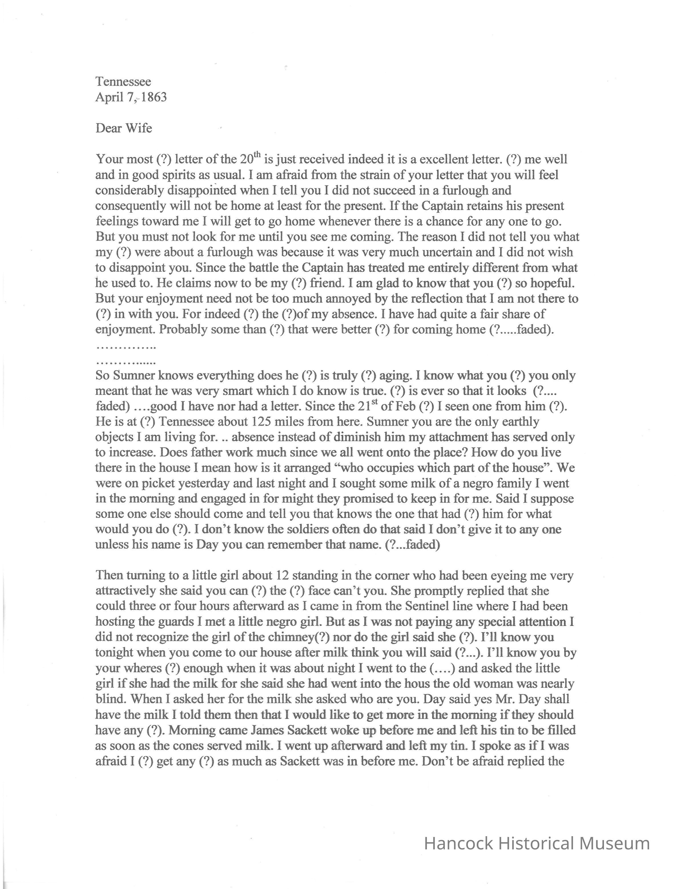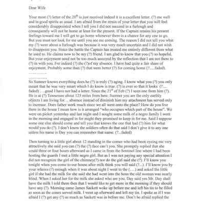 The image depicts an old letter written on yellowed paper, apparently dated "April 27, 1863," and addressed from "Camp Drake, Tennessee." The letter is handwritten in cursive and begins with "Dear wife," suggesting personal correspondence typical of the mid-19th century. The ink is faded, making some sections hard to decipher but retains a nostalgic aesthetic. The letter seems to discuss various personal matters, including relationships and feelings, possibly during a wartime period. The overall appearance suggests historical significance, possibly related to Civil War-era communications between spouses.