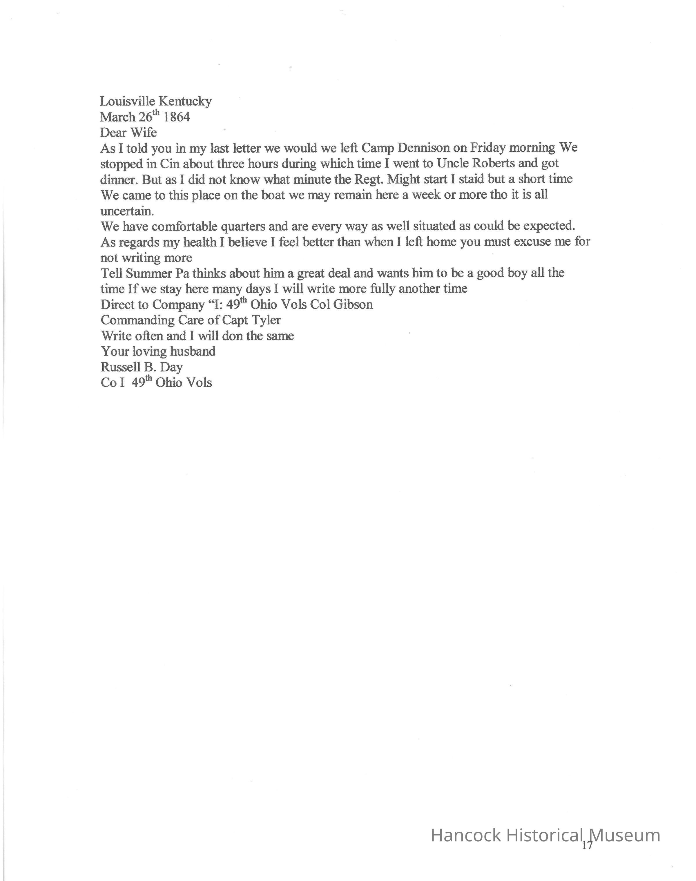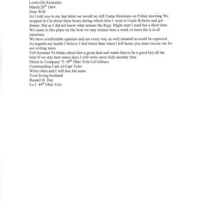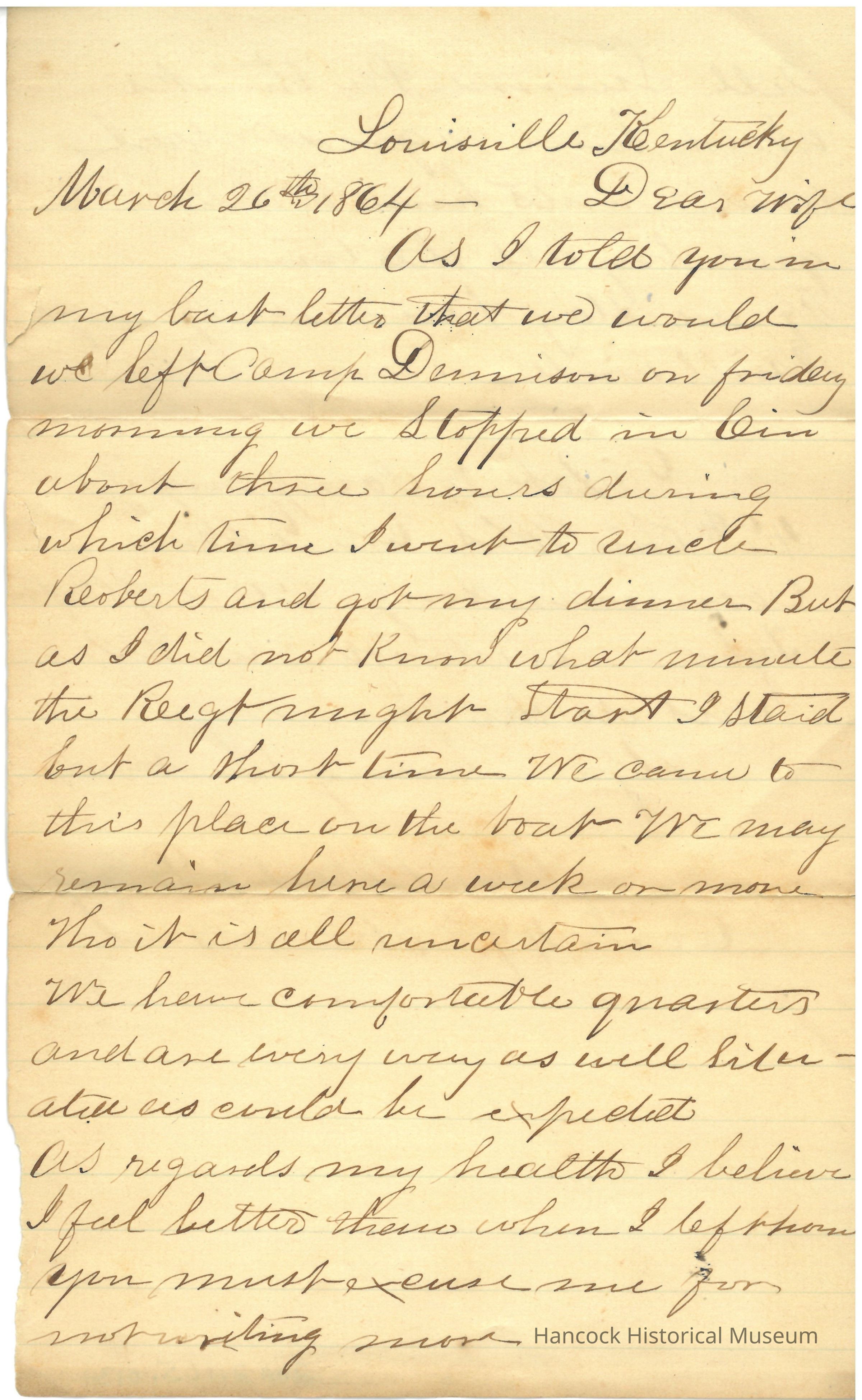 The image shows a handwritten letter dated March 26, 1864, from Louisville, Kentucky, addressed to "Dear wife." The writer mentions leaving Camp Dennison on Friday morning and stopping in Cincinnati for a few hours, during which time they visited Uncle Roberts for dinner. The letter discusses the uncertainty of their schedule and how long they will remain at their current location, possibly a week or more, though nothing is certain. The writer describes their living quarters as comfortable and better than expected. They also note feeling healthier than when they left home and apologize for not writing more.
