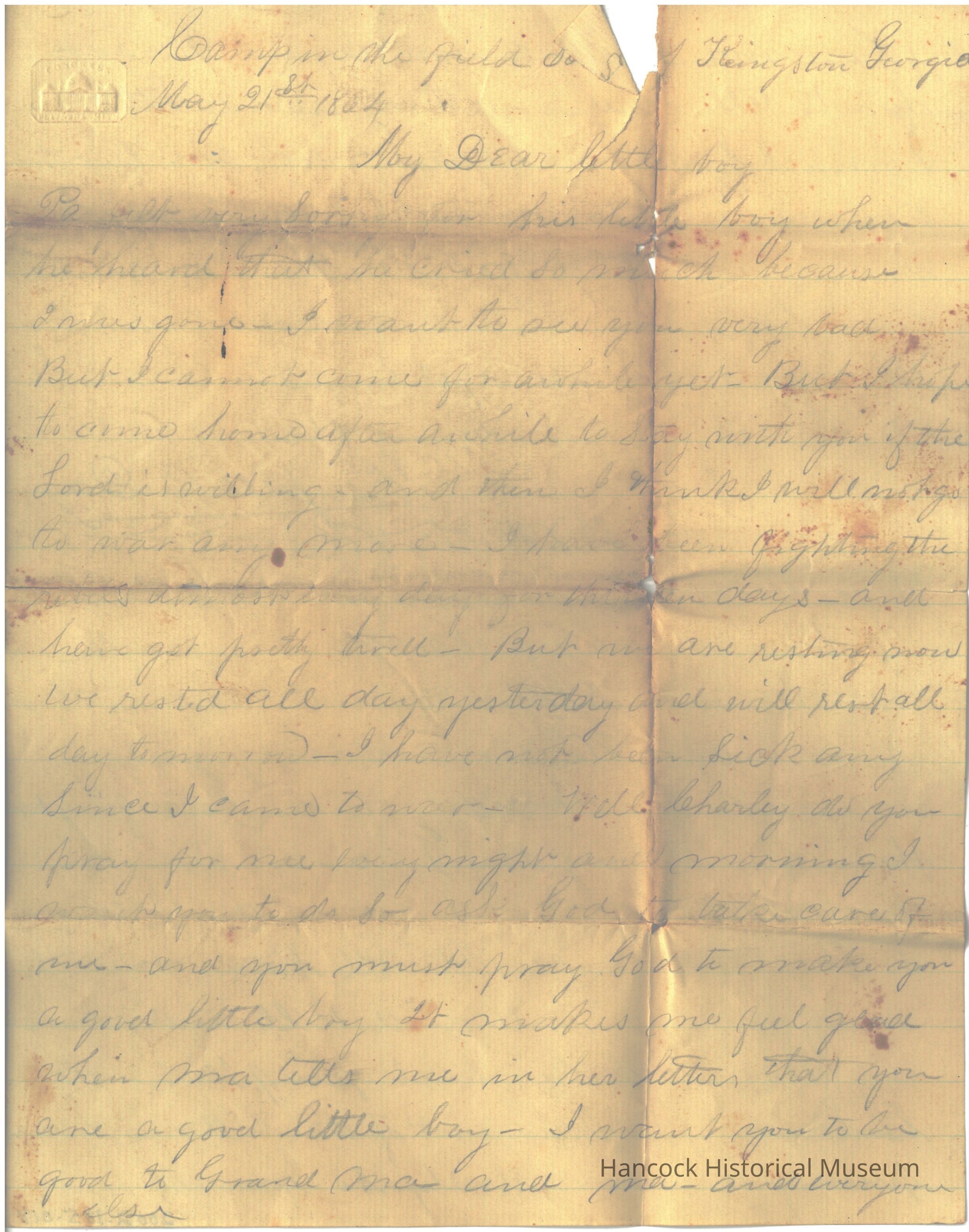 Civil War letter from Russell B Day to his wife dated May 21, 1864.