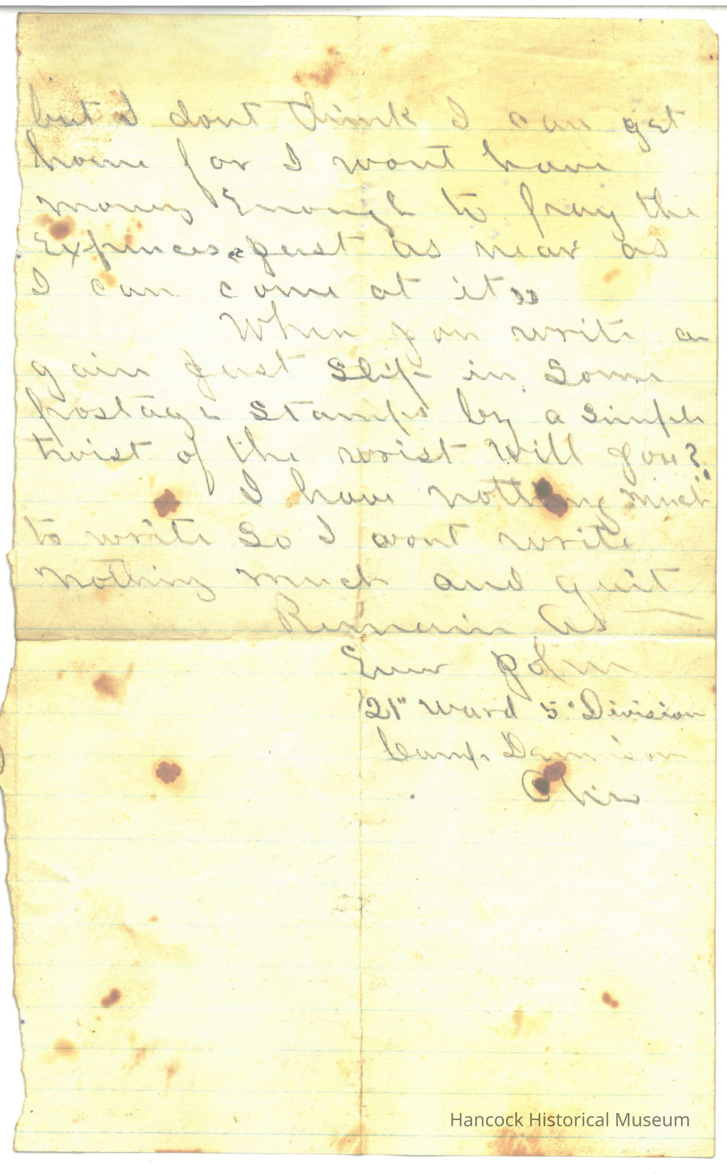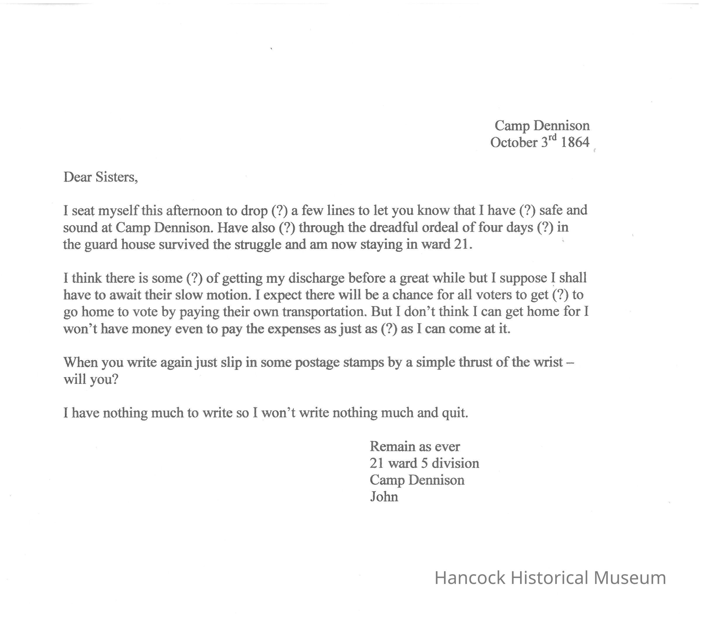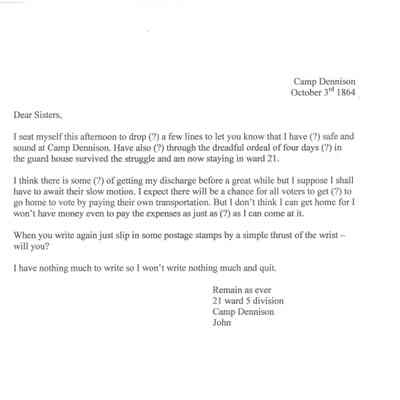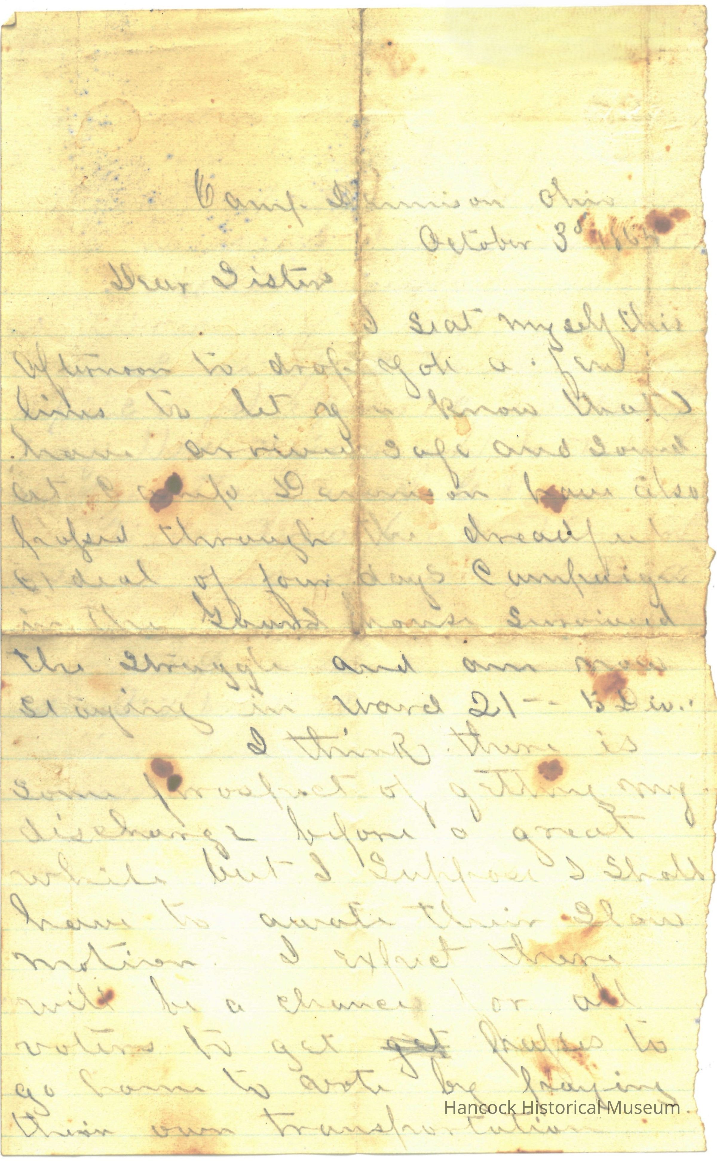 Civil War Letter from John Turner to his sister, Oc 3, 1863.
