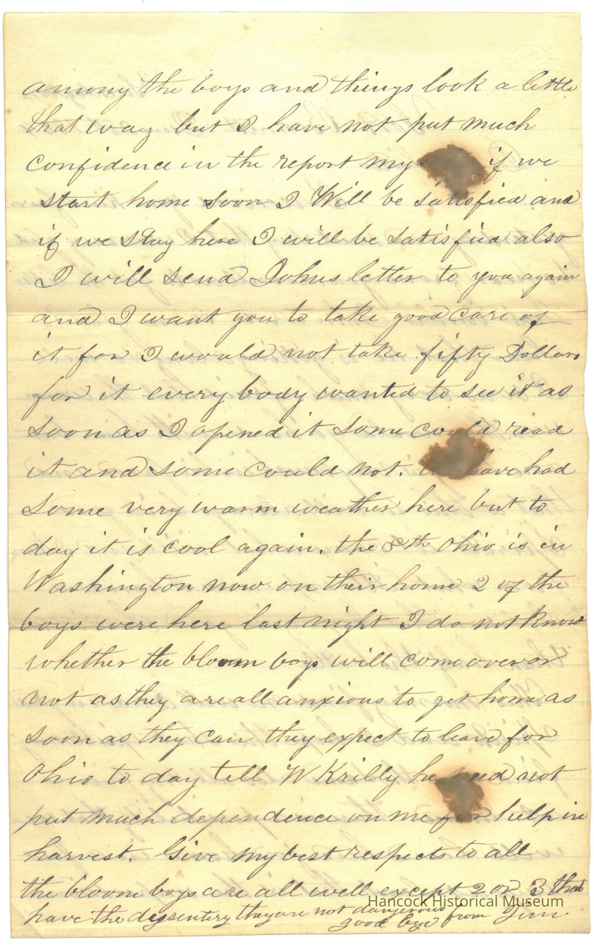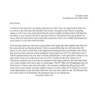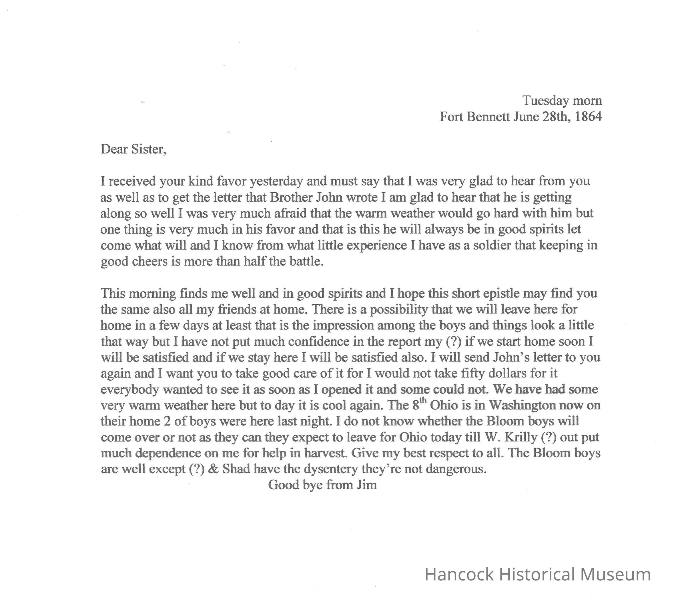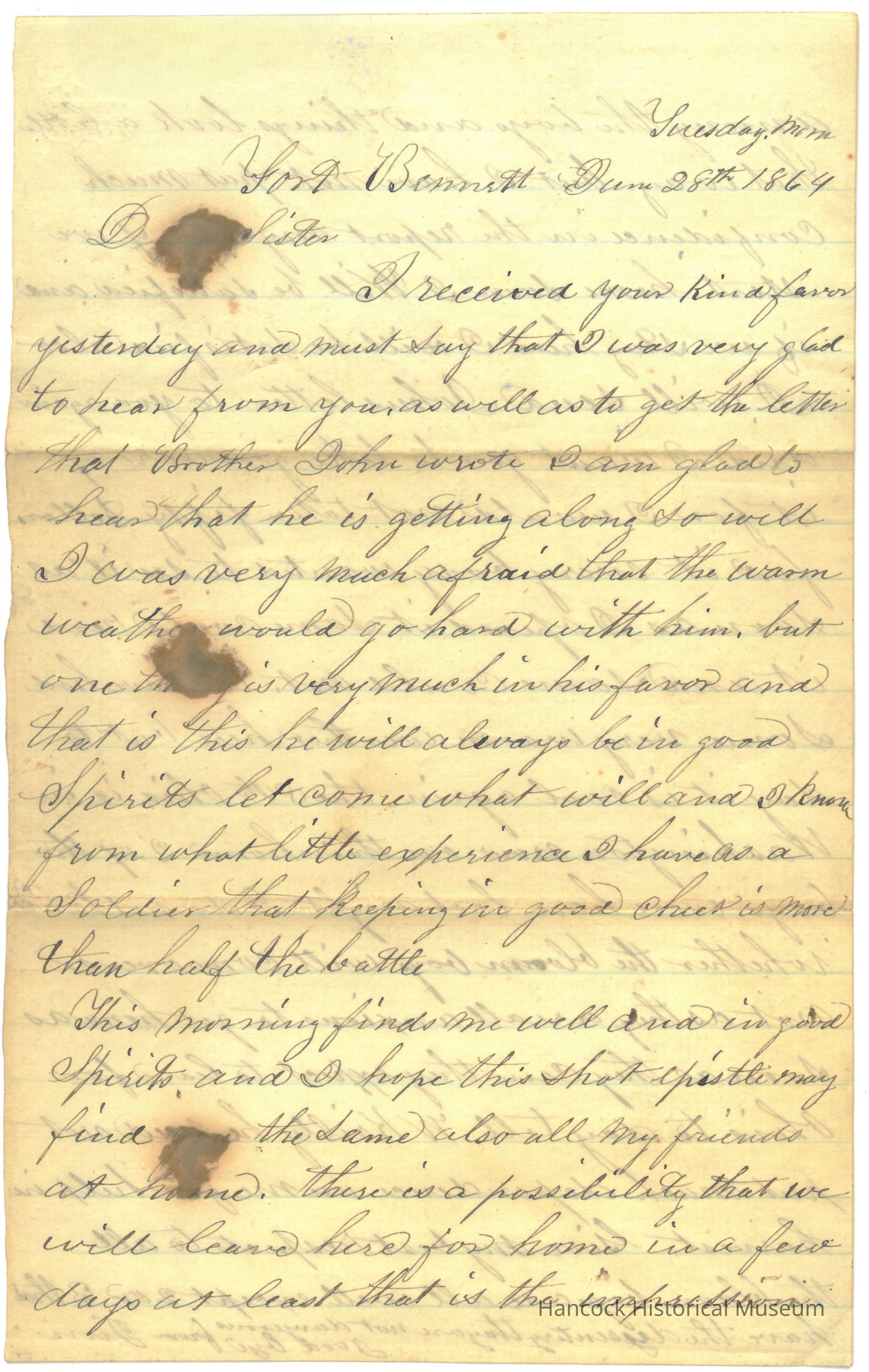 The image displays an old handwritten letter dated December 28, 1864, from a place named Fort Bennet. It appears to be written in cursive, using ink on aged, yellowed paper. The letter begins with "Dear Sister" and expresses the author's gratitude for receiving news from the sister. The writer mentions being glad to read a letter from Brother John, indicating that he is doing well. Concerns about Brother John's situation are discussed, but there is optimism about his spirits and well-being. The writer emphasizes the importance of maintaining a positive outlook, suggesting it is vital during challenging times. A prominent ink blot is visible on the upper left side of the paper, adding to the historical character of the letter. Despite its age, the handwriting is relatively clear with a slight tilt to the right, typical of the cursive style used in the 19th century. The letter concludes with well-wishes for friends, reflecting a hopeful and caring tone.