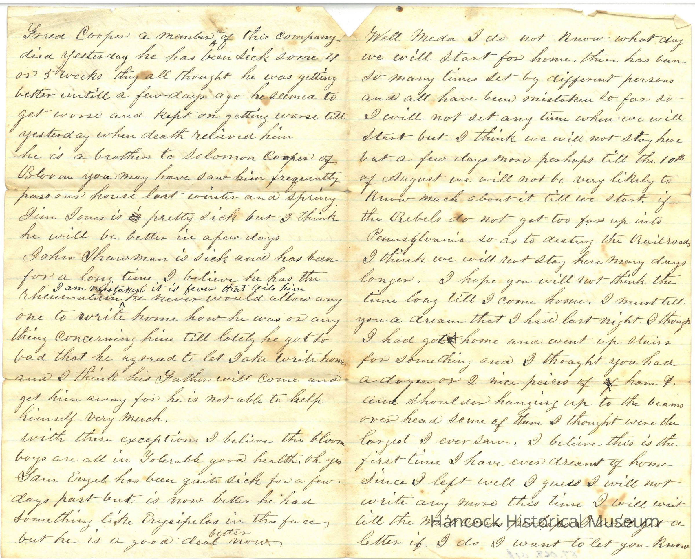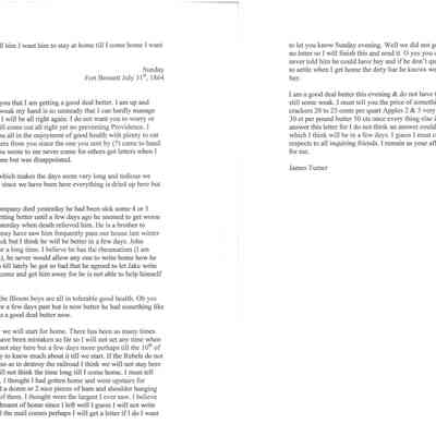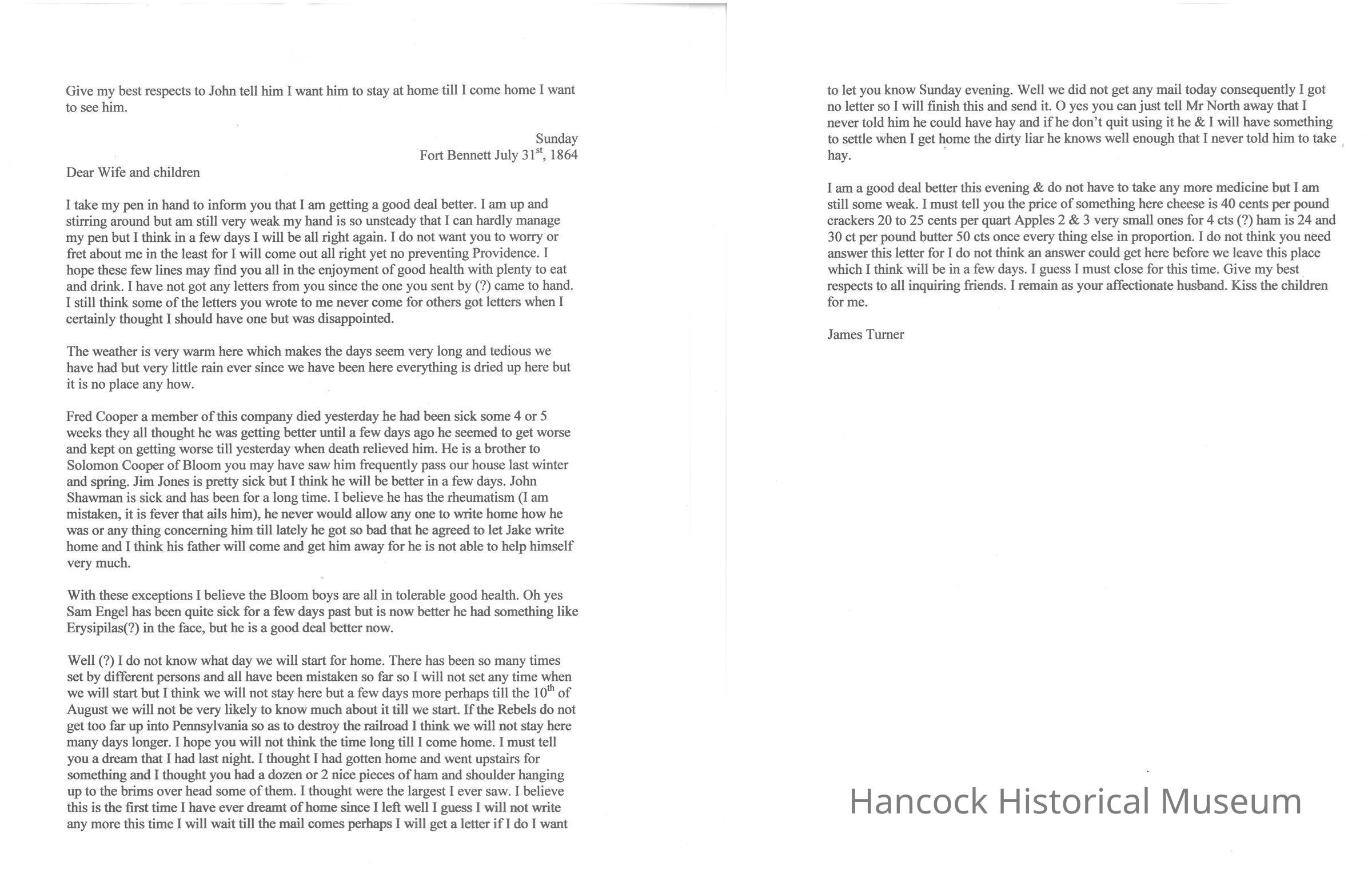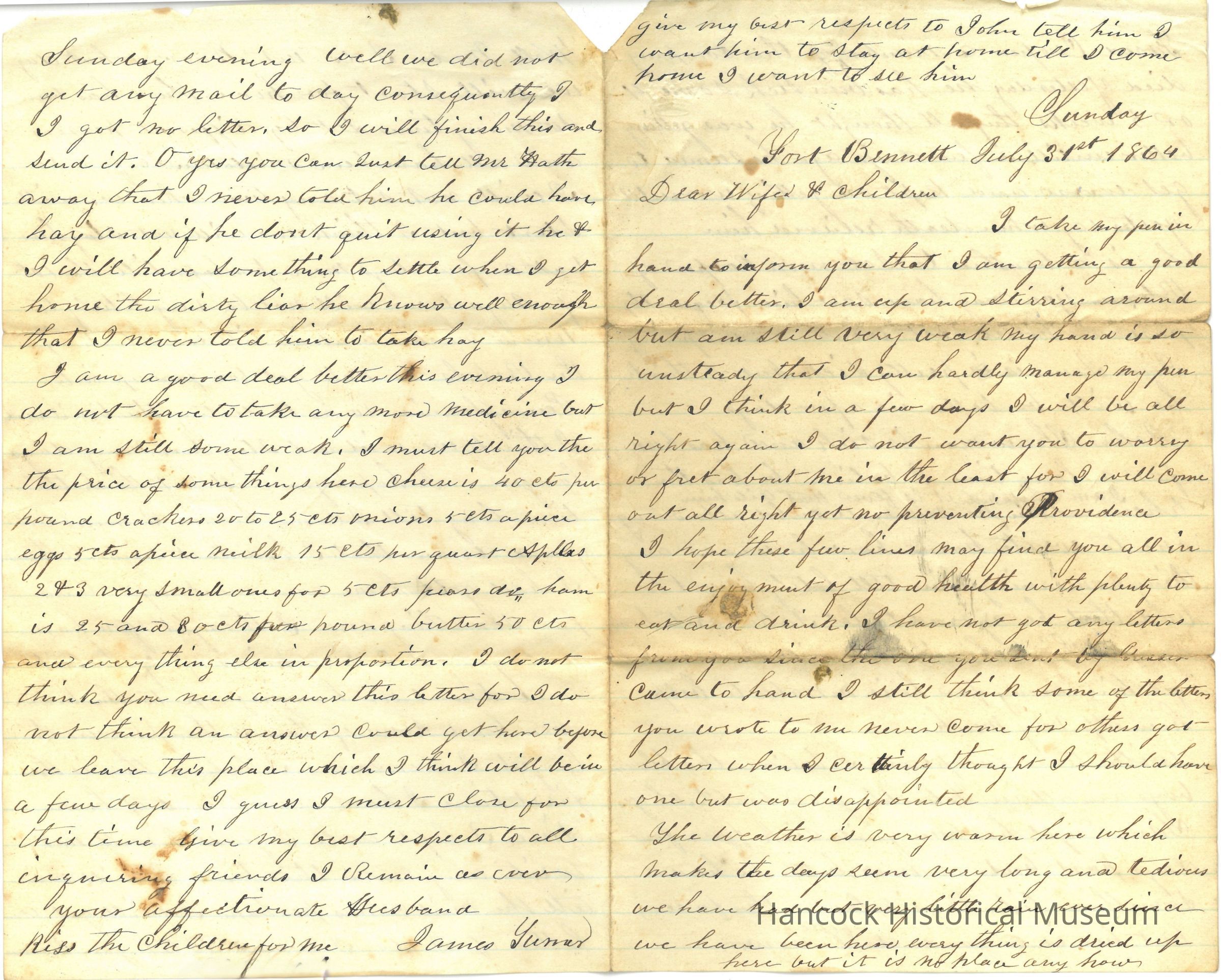 The image displays a handwritten letter on aged paper with visible creases and discoloration, indicating its historical nature. The letter is written in black ink with a cursive script that is neat yet slightly faded over time. The text begins with a date and location: "Fort Benett July 31st 1864," suggesting it is from the Civil War era. The letter is addressed to the author's wife and children, expressing feelings of longing and care. The content discusses various topics, including the author’s improving health, the high prices of goods like eggs and butter, and instructions regarding family affairs. The tone is personal and affectionate, reflecting the emotional distance between the writer and the recipients due to the circumstances of the time. The closing includes warm regards and the name "James Turner." The entire document conveys a sense of intimacy and historical significance, offering a glimpse into the personal lives of individuals during the 19th century.