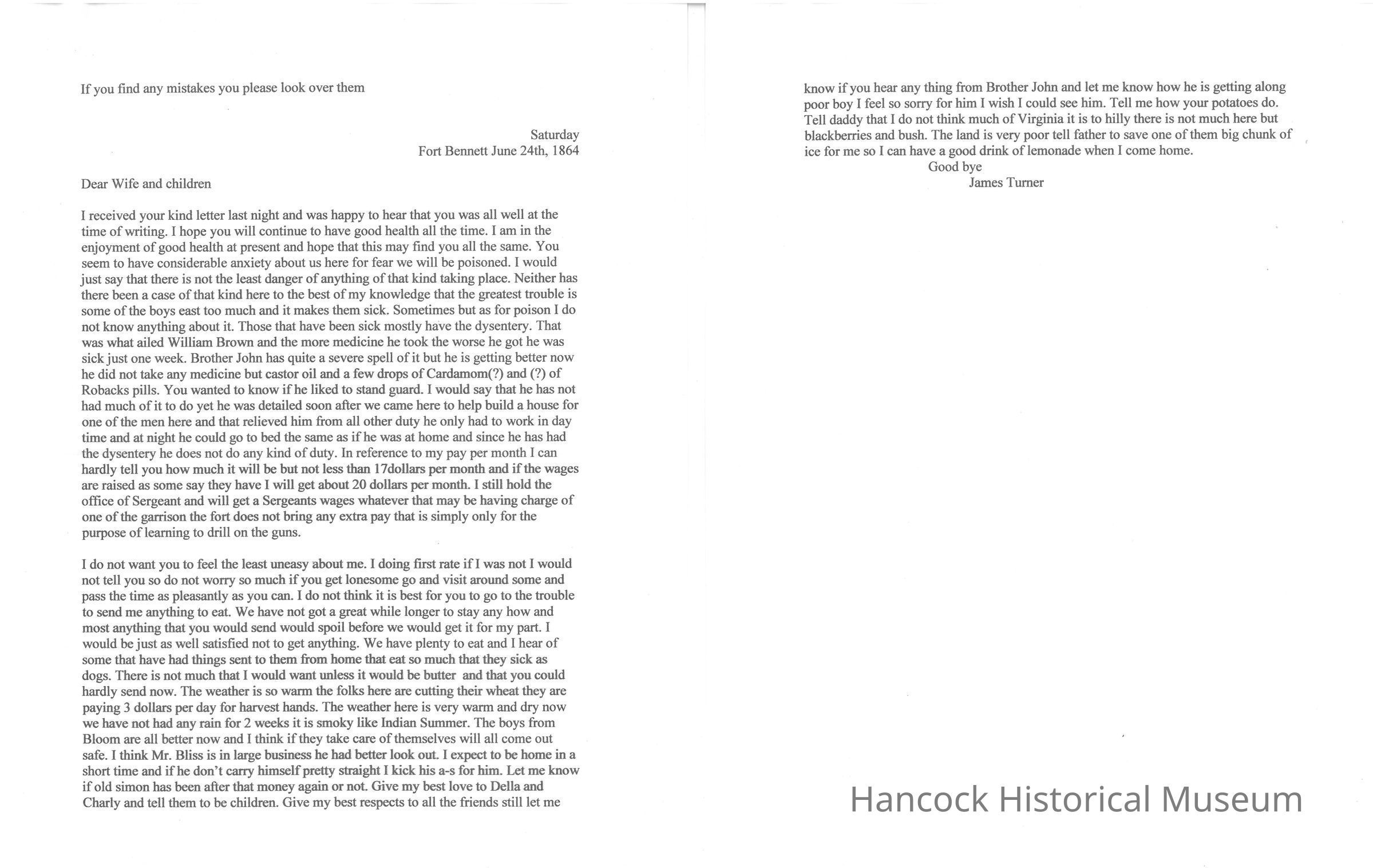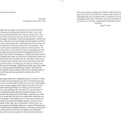 The image displays an old handwritten letter on yellowed paper, written in black ink. The letter begins with the date "June 24th, 1864" and is addressed to "Dear Wife and Children," originating from "Fort Bennett." The content is written in cursive, discussing personal matters, likely from a soldier or traveler, mentioning health, well-being, and the weather. The handwriting is neat and organized, with some parts emphasizing concerns about health and safety. The letter continues onto a second page, filled with updates and expressions of affection. The tone suggests an intimate correspondence, common for the 19th century.