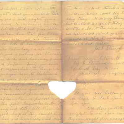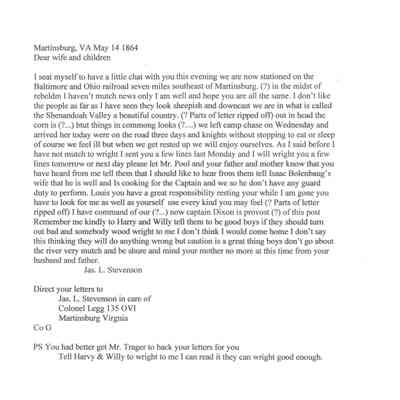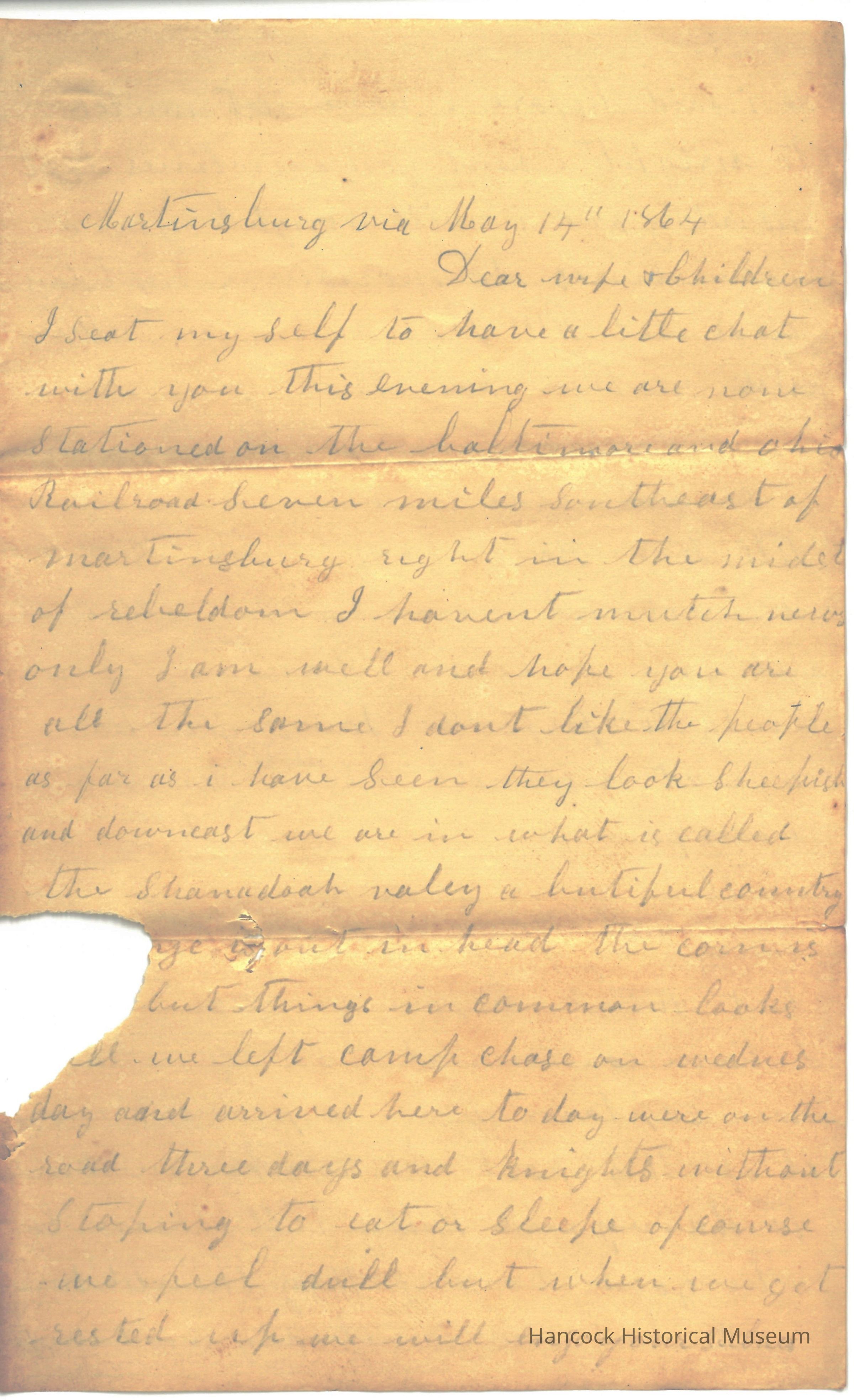 The image depicts an old handwritten letter dated May 17, 1864, from Martinsburg, Virginia. The letter is addressed to the writer's wife and children, expressing a desire to have a chat with them. The writer mentions being stationed near the Baltimore and Ohio Railroad, seven miles southeast of Martinsburg, in a region termed "rebeldom." Despite the lack of news, the writer conveys hope that the family is well. The letter describes the local people as cheerful and the area as part of the beautiful Shenandoah Valley. The writer also recounts a journey taken over three days and nights without rest, concluding with a note on feeling tired but looking forward to rest soon.