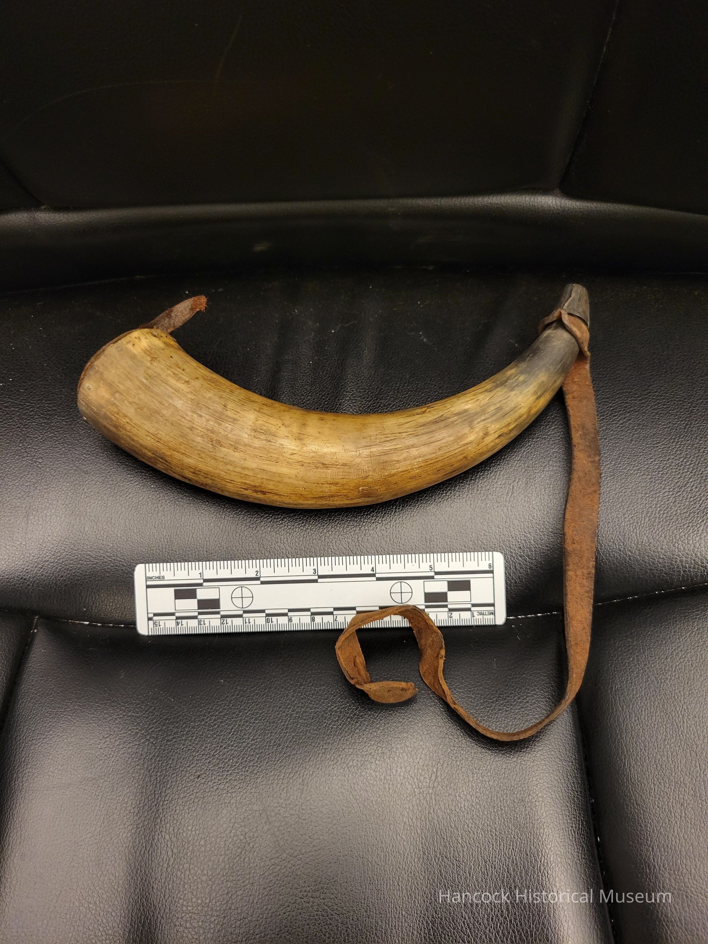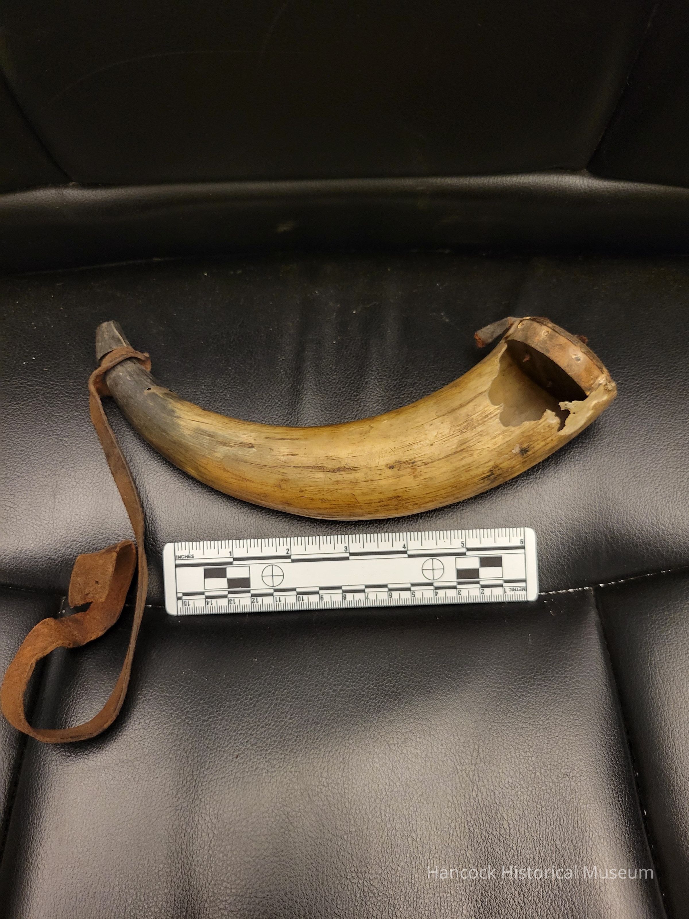 3 x 9: Civil War powder horn w/broken strap and missing stopper. Part of horn broken off.