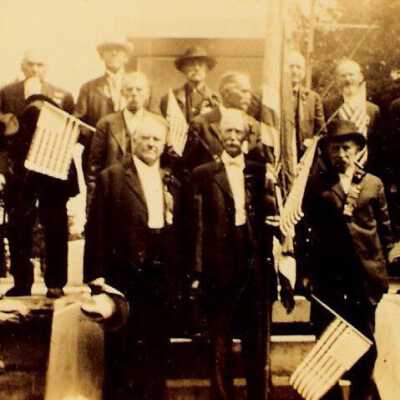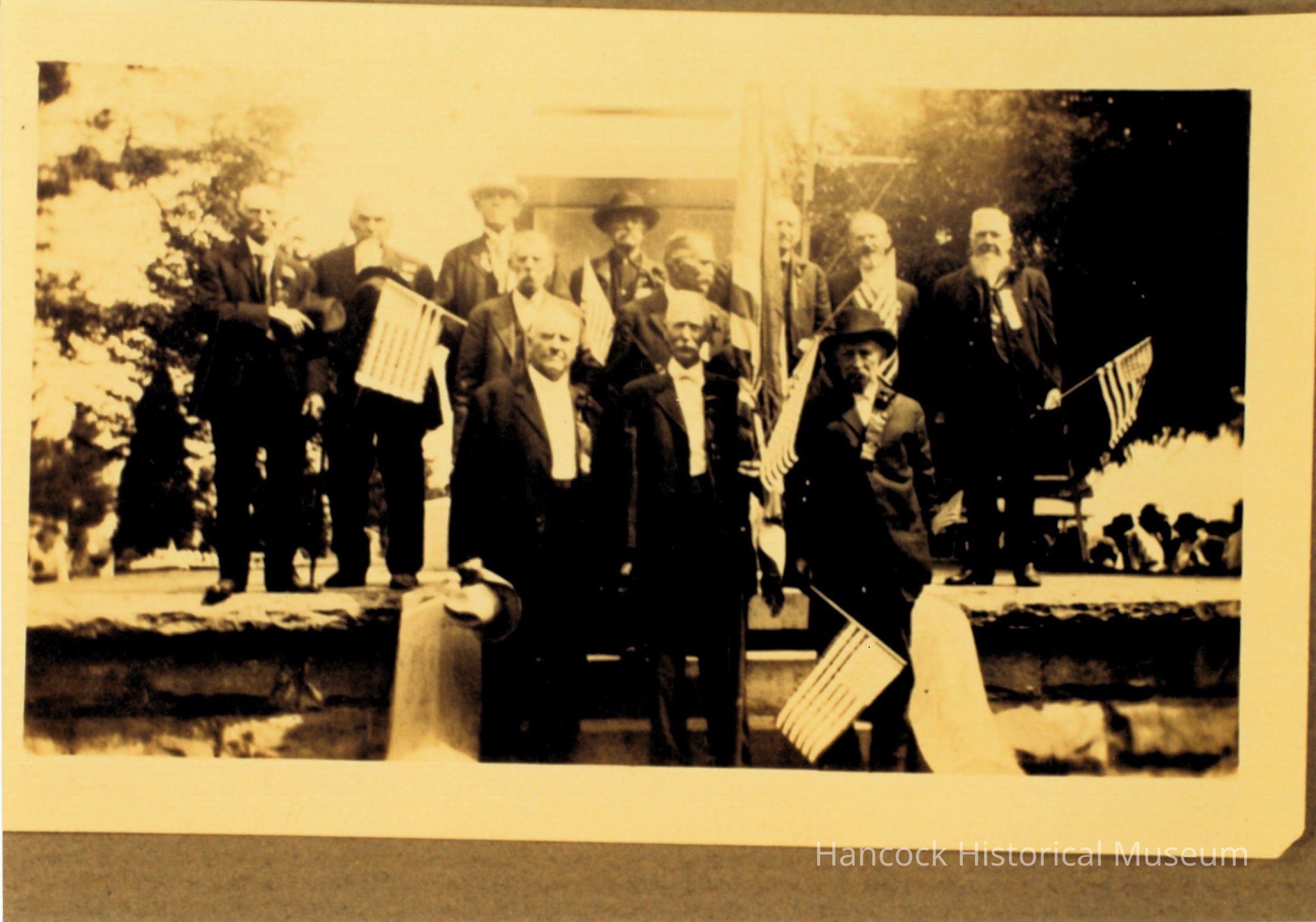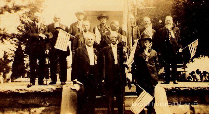 3 1/2 x 5 b/w photo of Civil War soldiers reunion possibly in Hancock County, Ohio. Unknown date and unidentified men c 1900