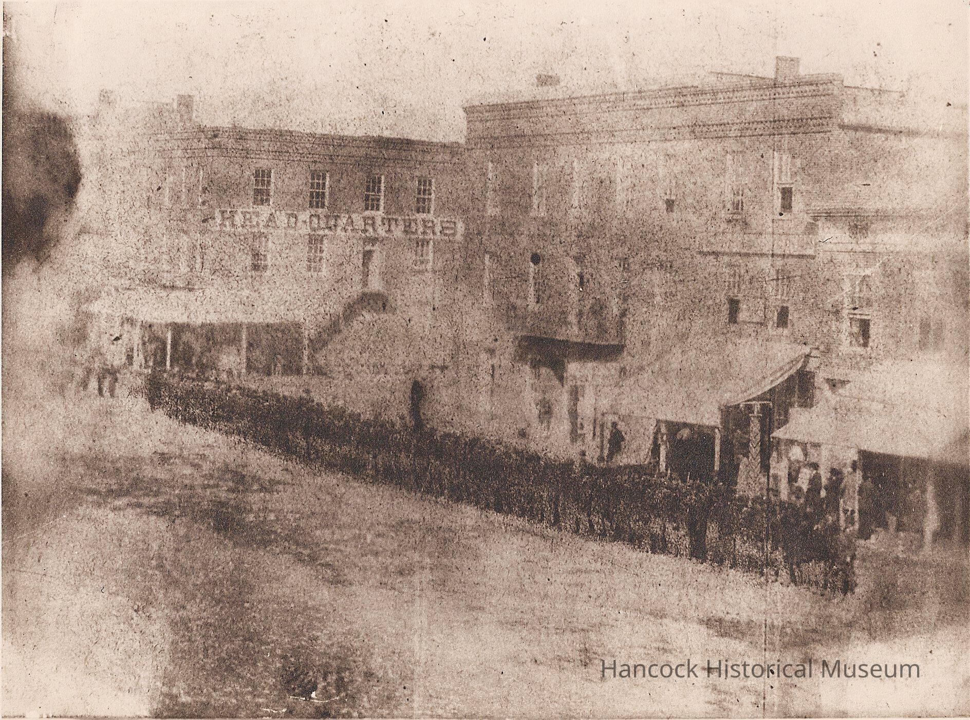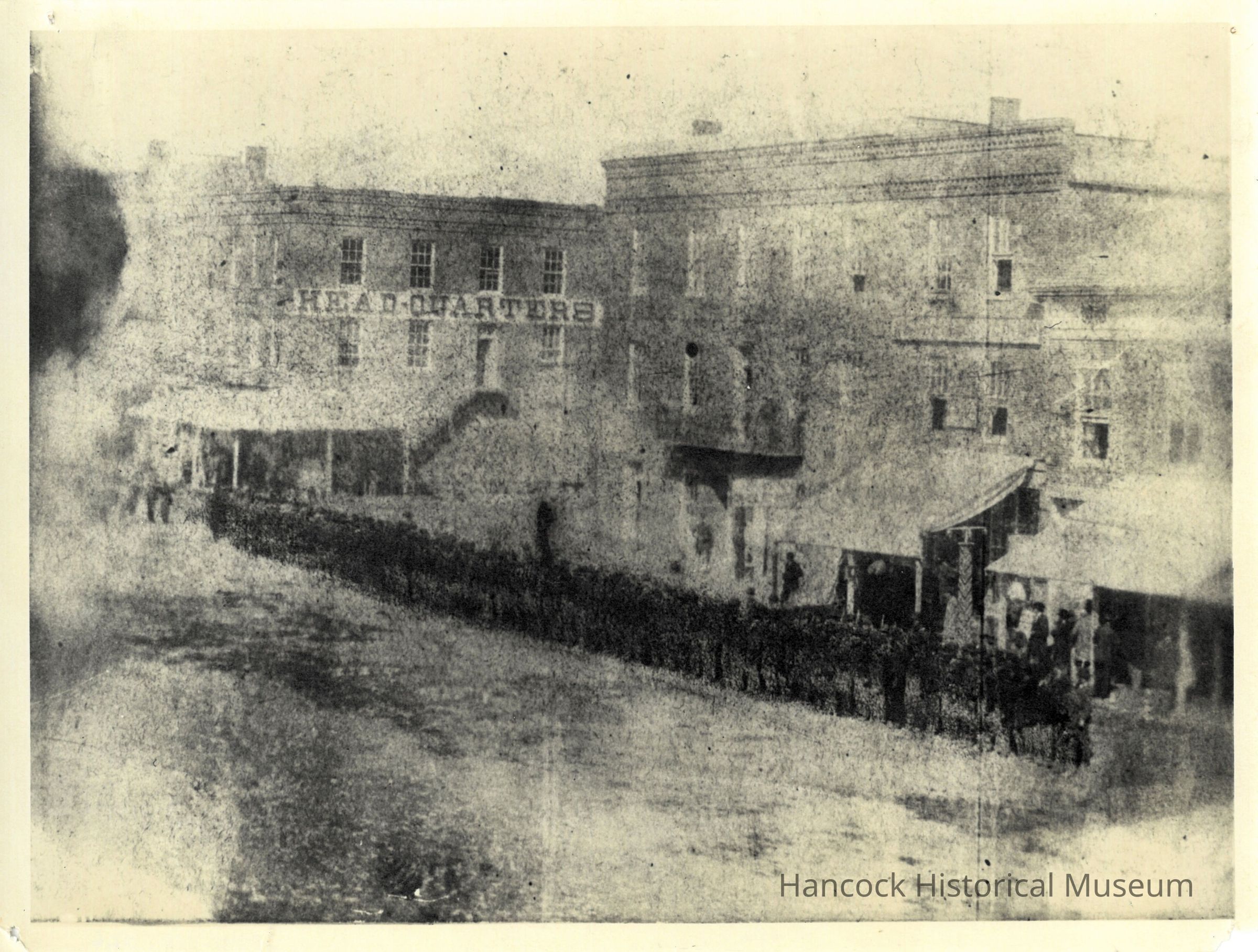 8 x 10 b/w photo of Civil War Soldiers lining up on South Main St at Main Cross St, Findlay, oh ready to march off to war 1862.Photograph Details