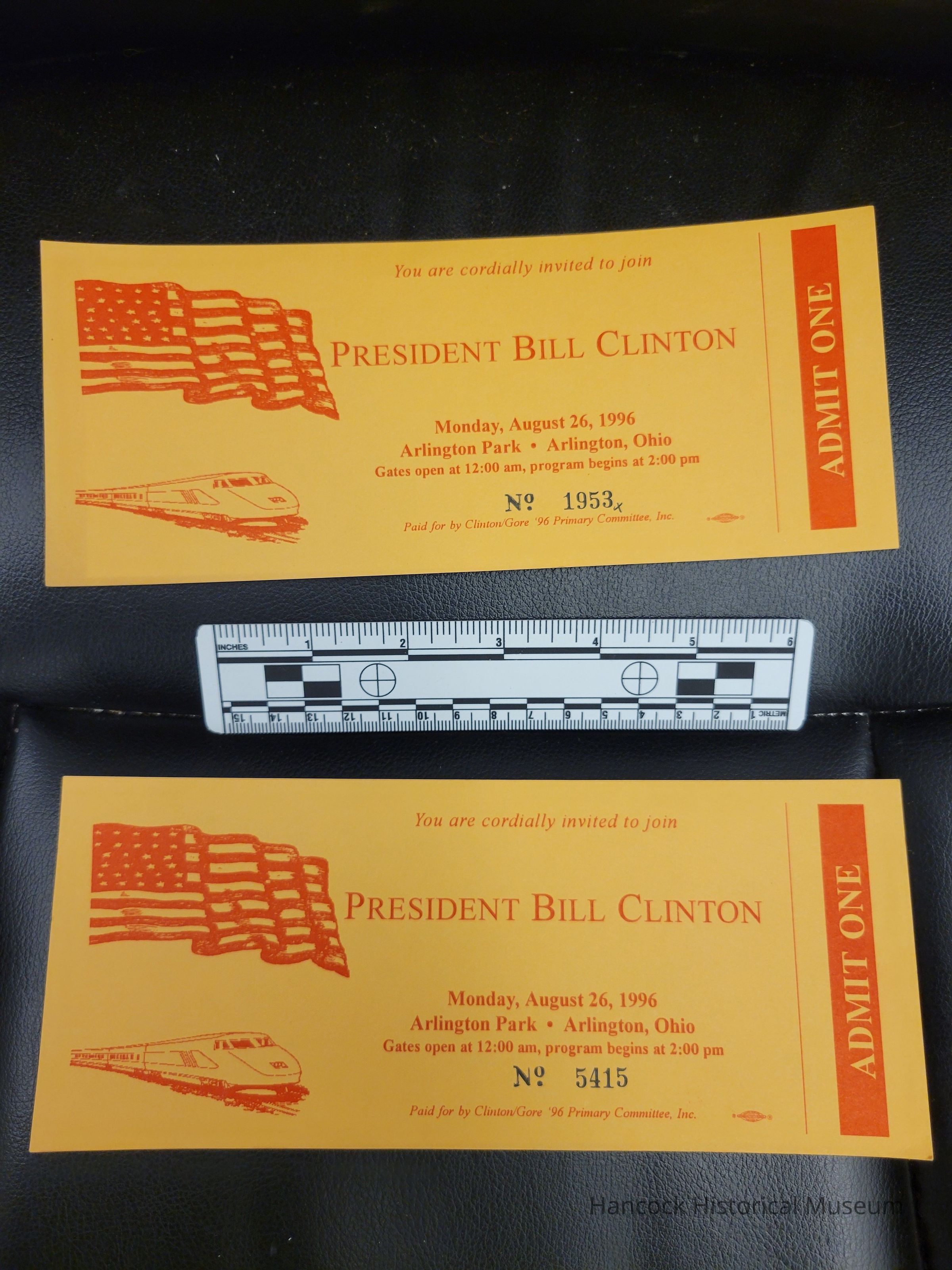 The image depicts two identical orange tickets inviting individuals to an event for President Bill Clinton, scheduled for Monday, August 26, 1996, at Arlington Park in Arlington, Ohio, with gates opening at 12:00 am and the program commencing at 2:00 pm, as stated on the tickets, which are numbered 1953 and 5415, respectively. Each ticket features a printed image of an American flag and a train, with the words "ADMIT ONE" running vertically