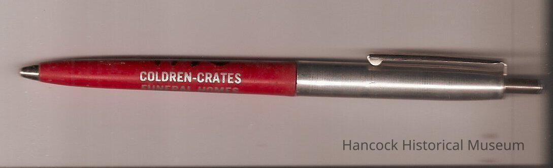 Red & silver ball point advertising pen from Coldren Crates Funeral Home, Arlington, Findlay & N Baltimore, OhCollection