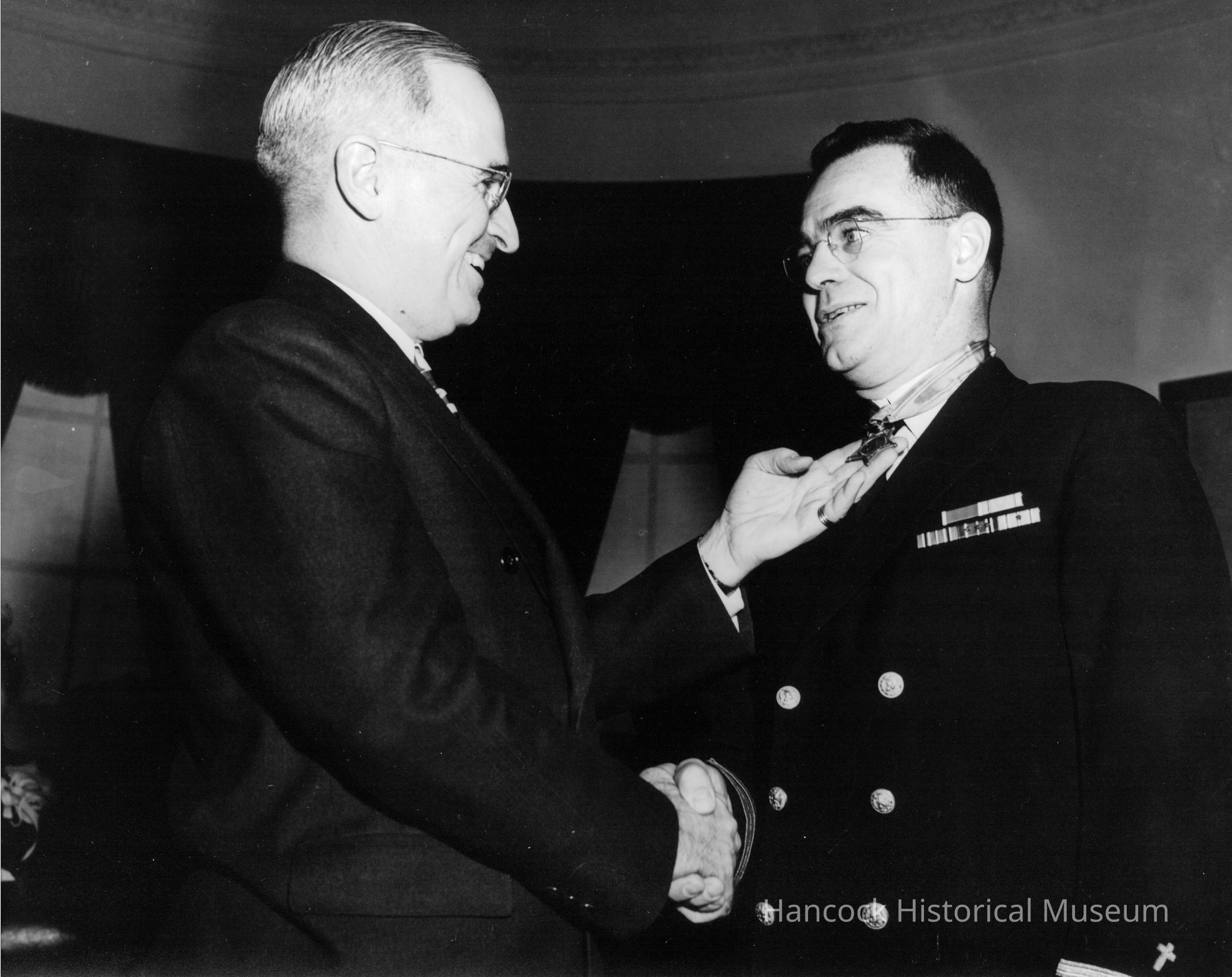 8 x 10 b/w photo of USS Franklin's Father Joseph T. O'Callahan, receiving the Congressional Medal of Honor award on January 23, 1946 from President Harry S. Truman after Japanese aircraft attack on Mar 19, 1945.