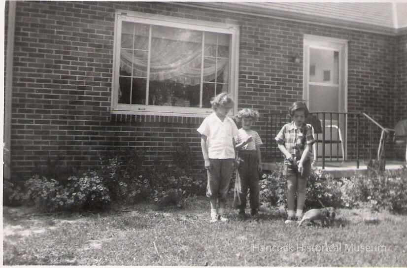 3 x 5 b/w photo of a brick 1 story house on Cumberland St, Arlington, Oh, w/children in front yard w/dog. Stober House.