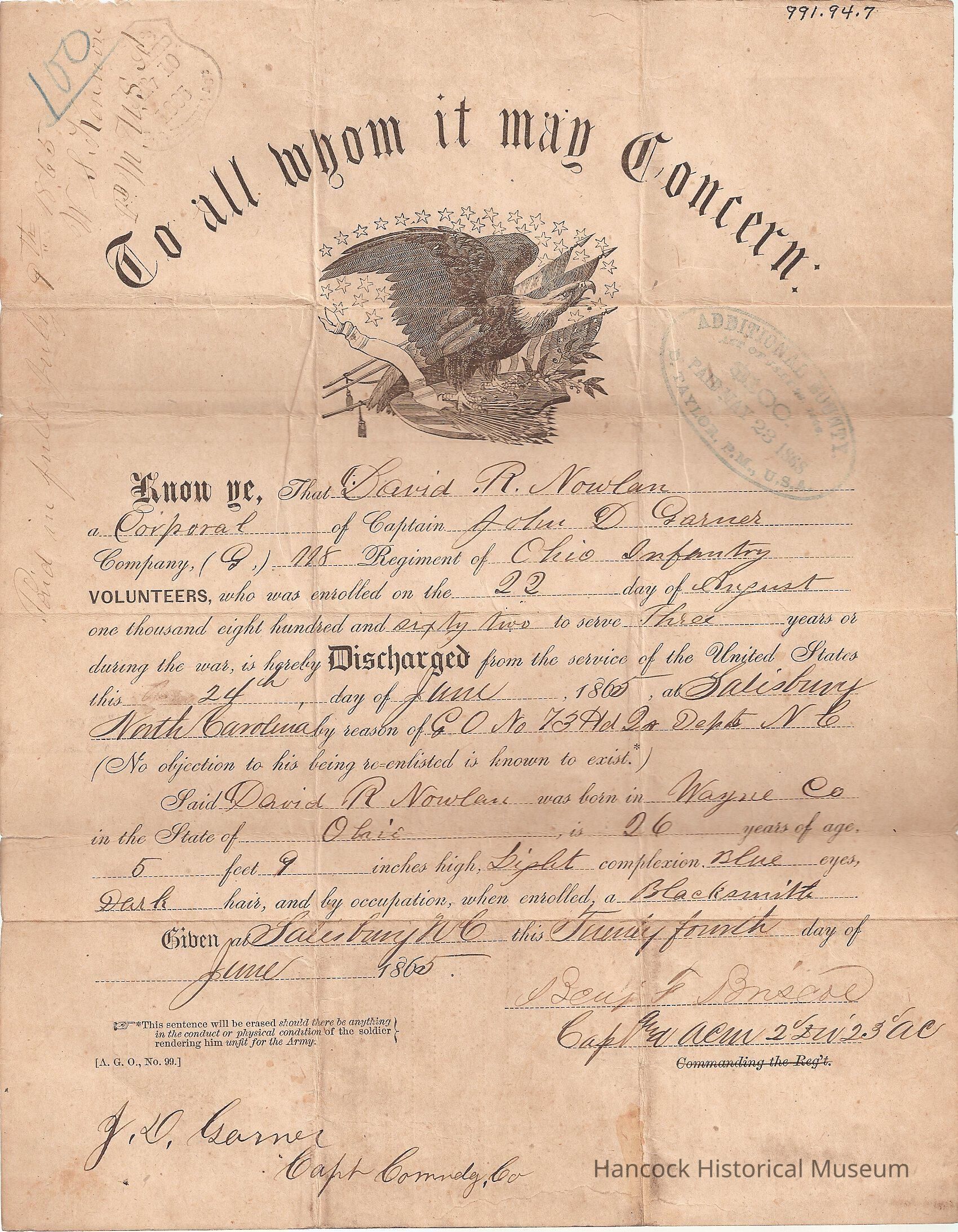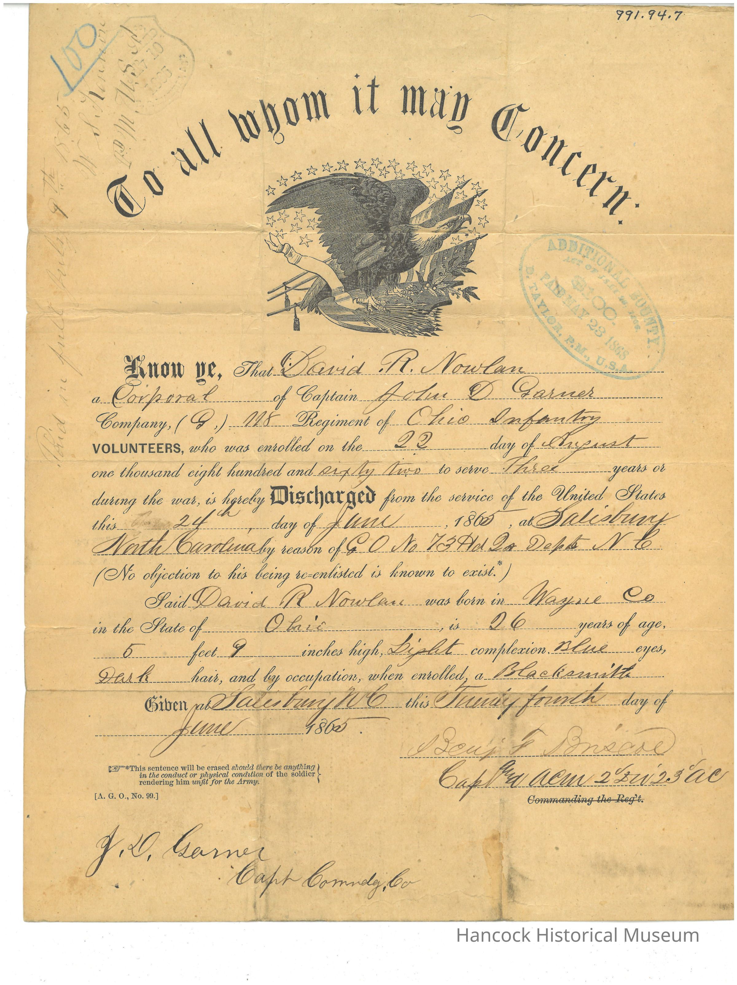 Discharge of David R Nowlan from 118th OVI dated Jul 24, 1865.