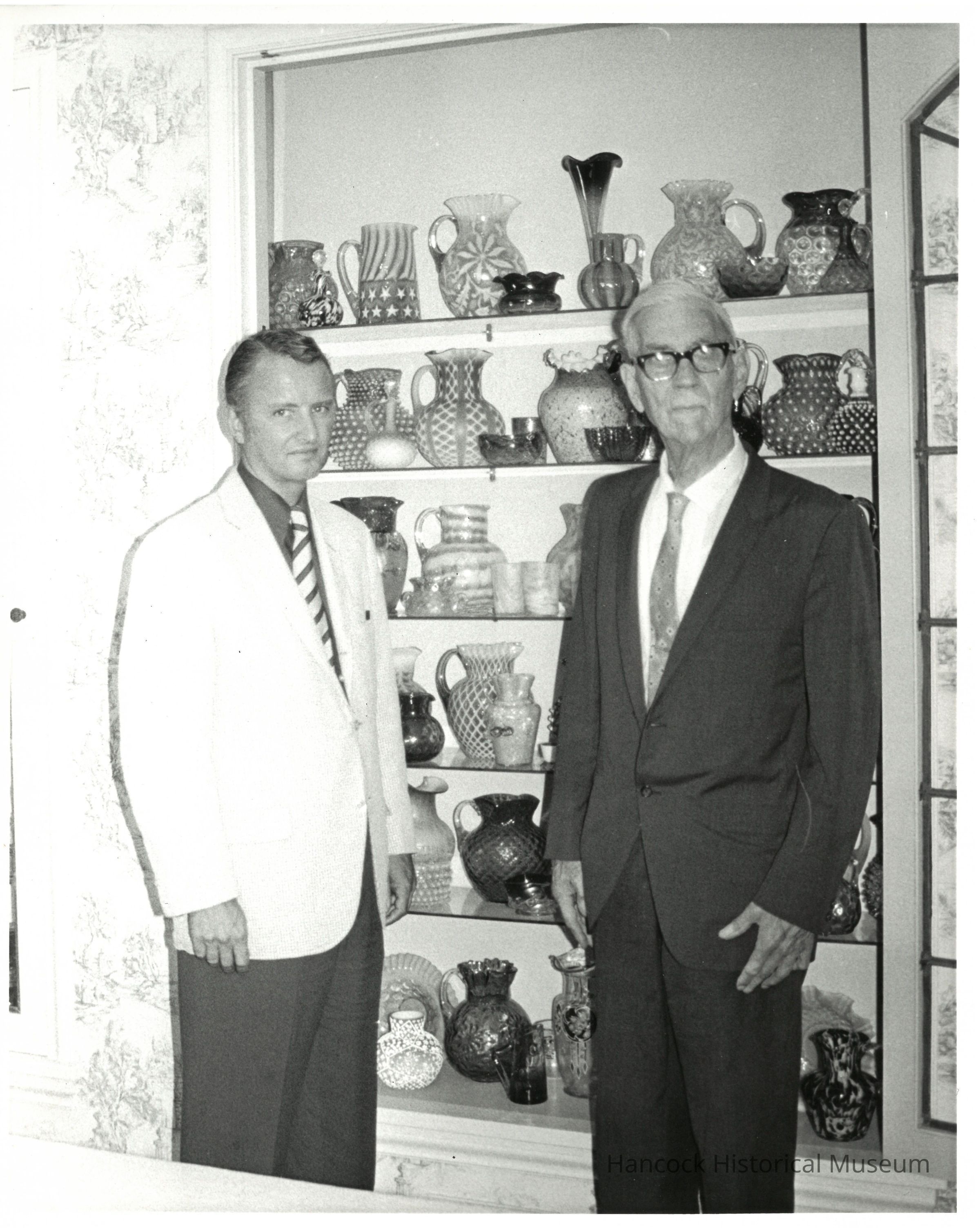 black and white photograph of the Pendleton Glass Collection with Ed Heminger and Judge Chester Pendleton