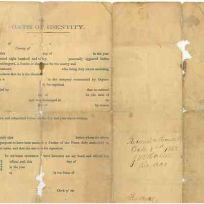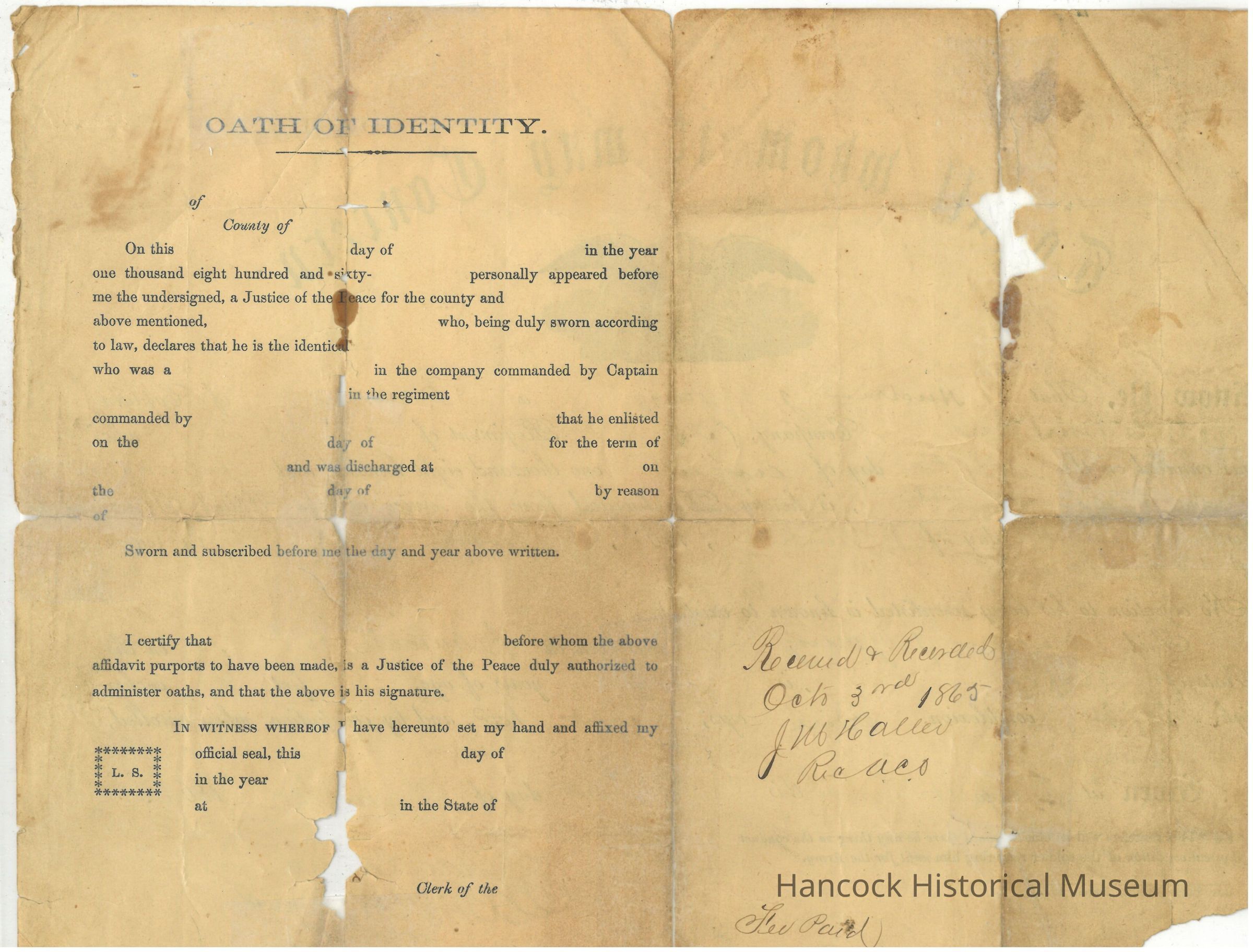 The image shows an aged military discharge document with noticeable wear, including folds, tears, and stains, indicative of its historical significance. The document contains handwritten and printed text on yellowed paper, featuring the phrase “To all whom it may concern” prominently in elegant script at the top. An illustration of an eagle—a symbol often used in official documents—is centrally positioned, adding a formal touch to the page. The text specifies details of an individual's military enrollment and discharge, referencing service in a particular regiment. Various handwritten notes, including dates and locations, are scattered throughout, adding personal and historical context to the document. The paper appears fragile, suggestive of its age and handling over time.
