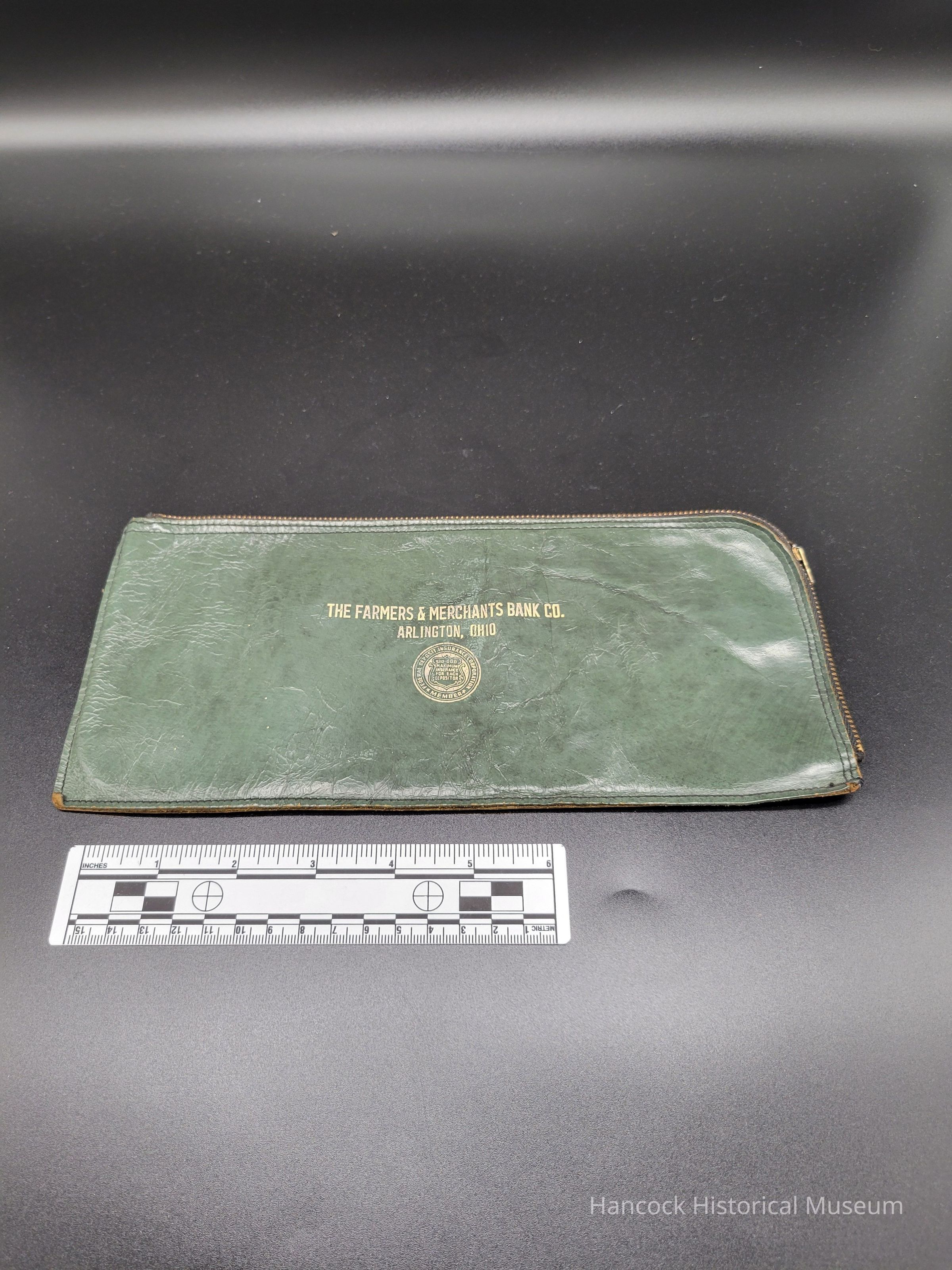 green leather money bag with gold lettering for The Farmers & Merchants Bank Co, Arlington, oh undated.Collection