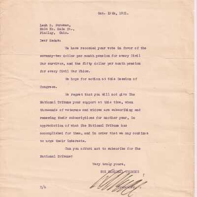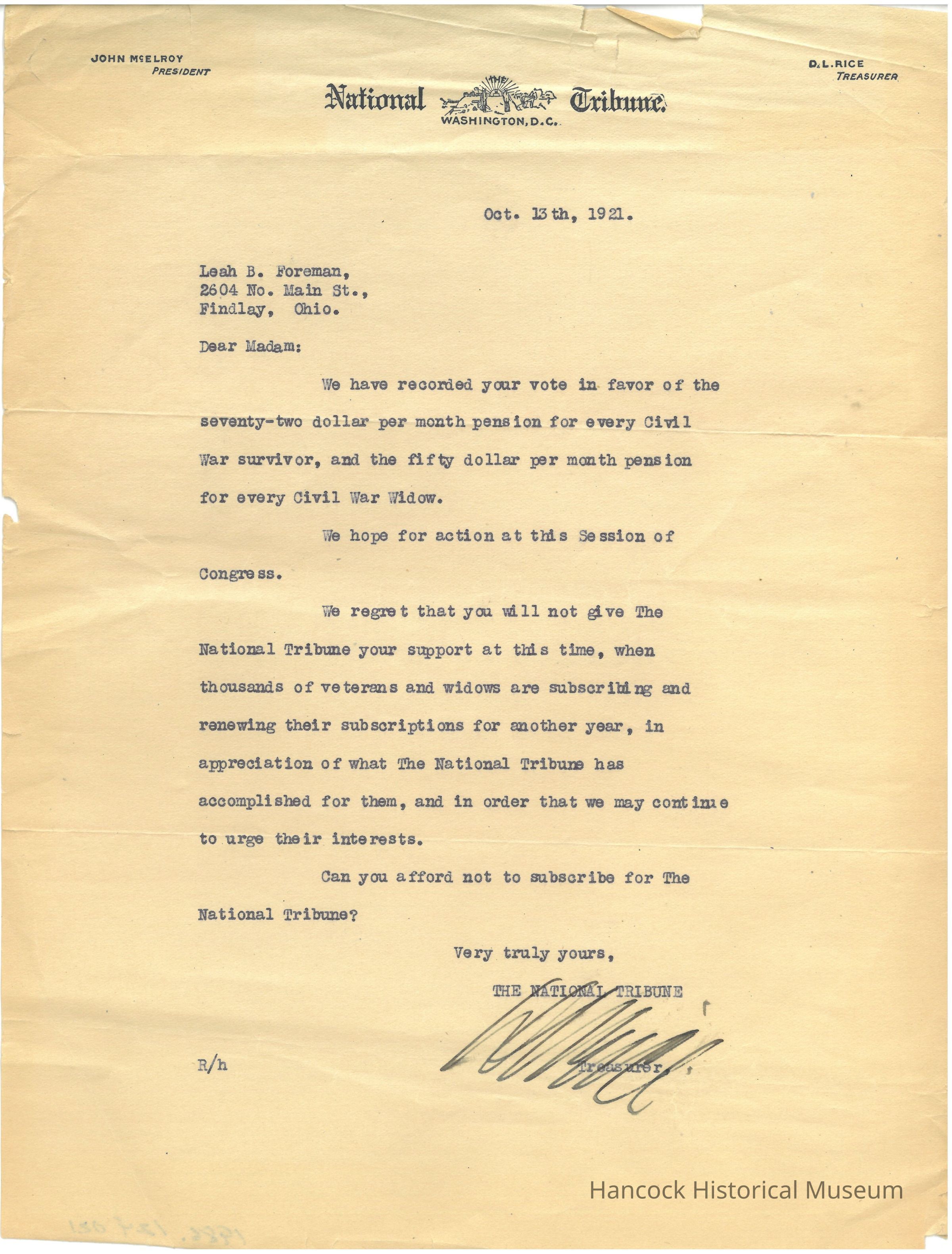 The image depicts a typed letter on The National Tribune letterhead, dated October 13, 1921, addressed to Leah B. Foreman of Findlay, Ohio. The letter acknowledges her vote in favor of a proposed pension increase for Civil War survivors and widows, amounting to seventy-two and fifty dollars per month, respectively. It expresses gratitude but notes her non-subscription to The National Tribune. The letter highlights the importance of support for the newspaper, citing how many veterans and widows are renewing subscriptions in appreciation of the Tribune’s advocacy. It questions if she can afford not to subscribe, emphasizing the newspaper's influence and efforts. It is signed by the Secretary of The National Tribune. The letter also provides context for legislative hopes and the ongoing need for community support to bolster veteran and widow interests.