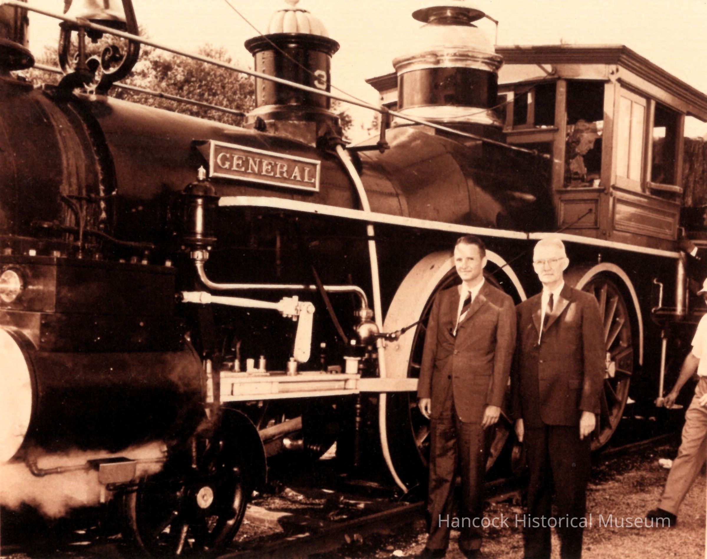 black and white photo of the General Locomotive taken in 1960s with Ed and R. L. Heminger in front of the train.