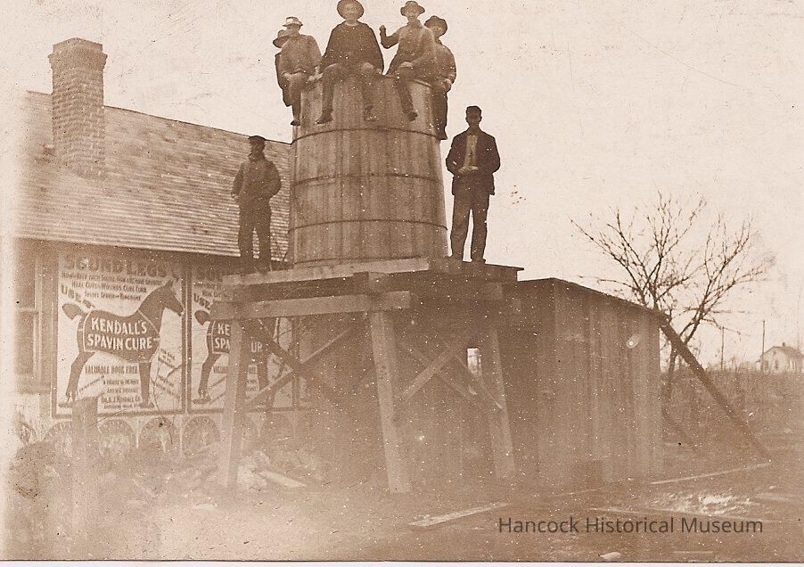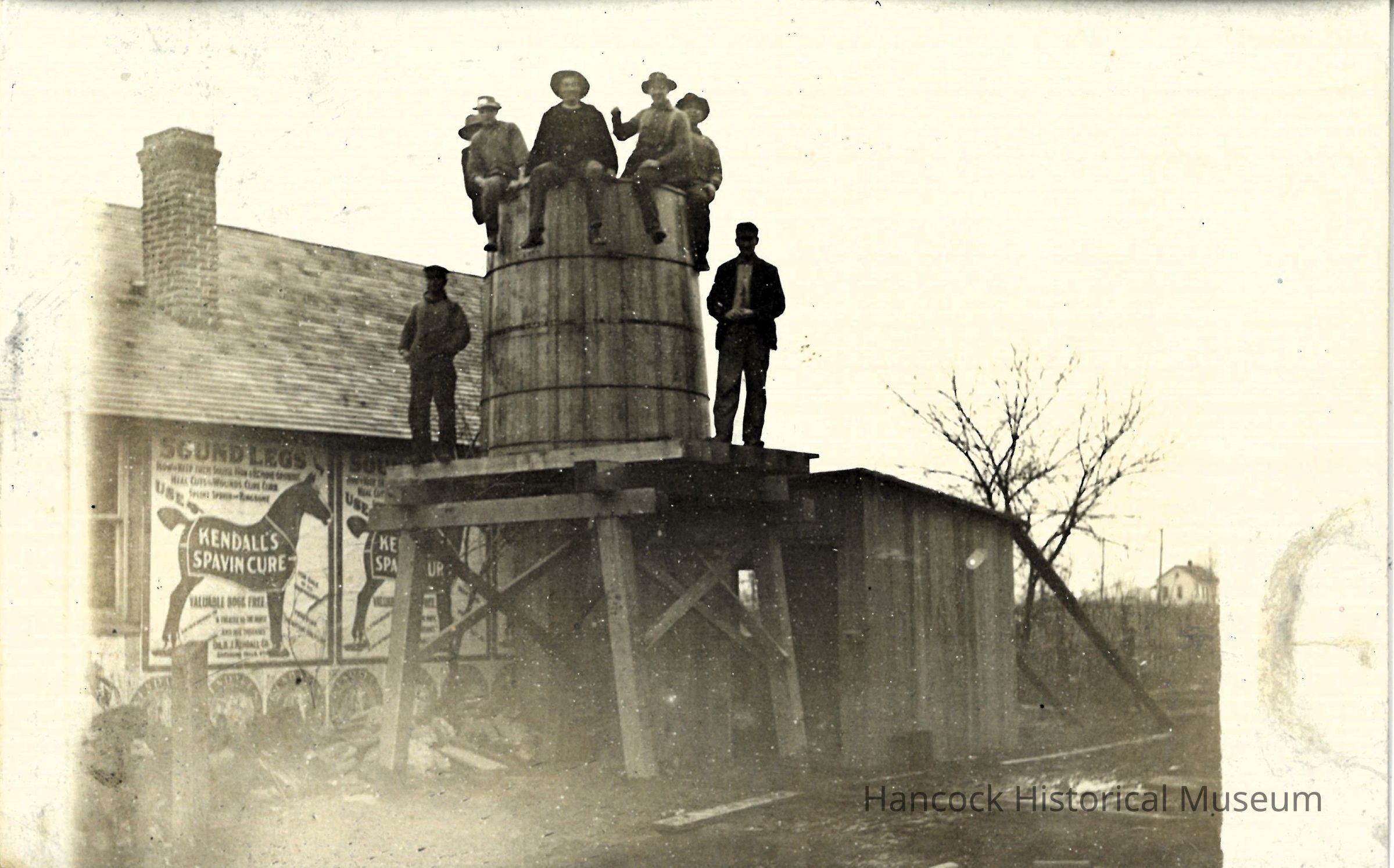 B/w photo postcard of Gilmer farm scene raising a water tank on platform w/ advertisement for Kendall's Spavin Cure on the side of building in background. Unused. Seven men standing on top of tank.Photograph Details