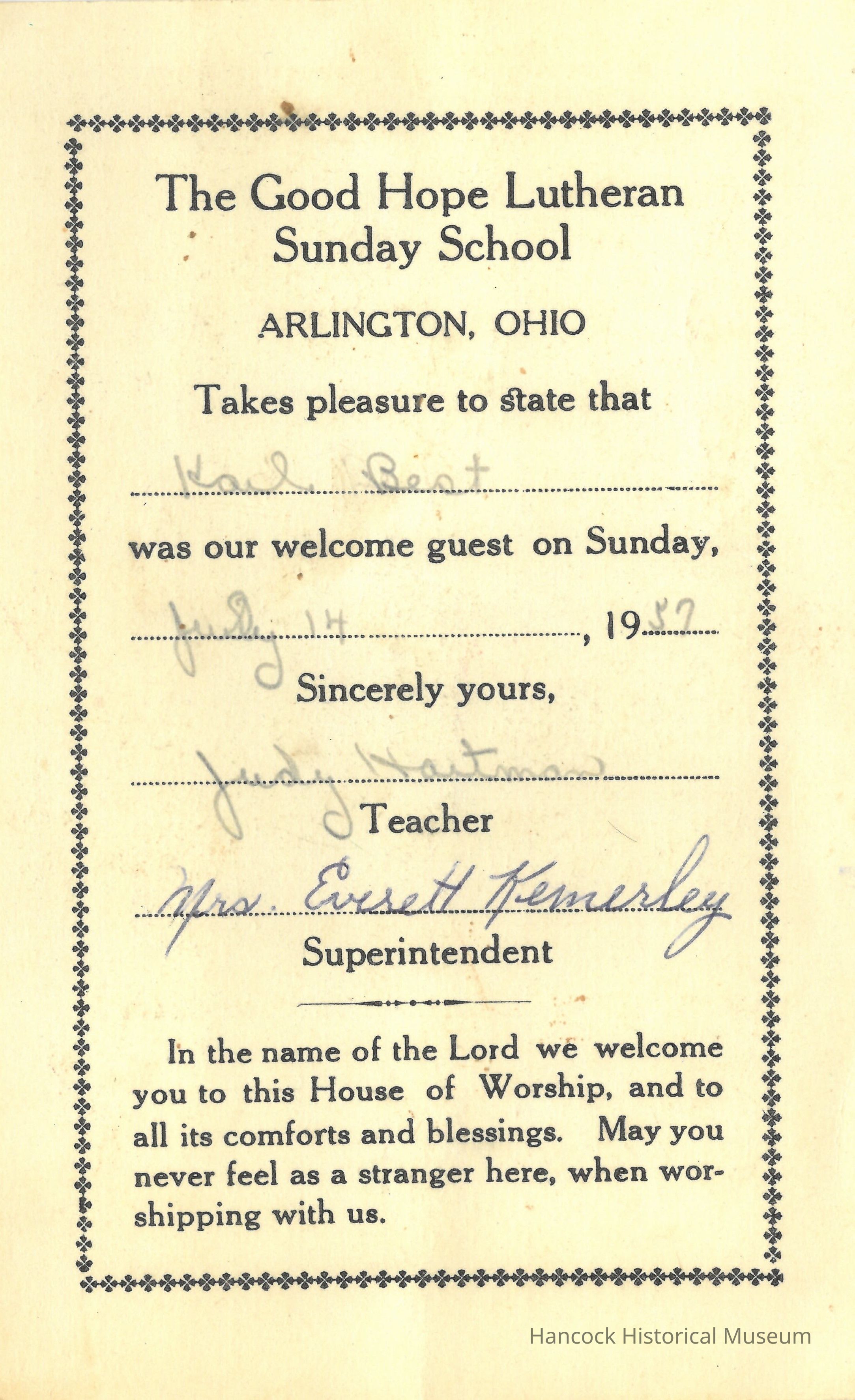 Postcard for Good Hope Lutheran Sunday School Karl Best July 14, 1957Collection