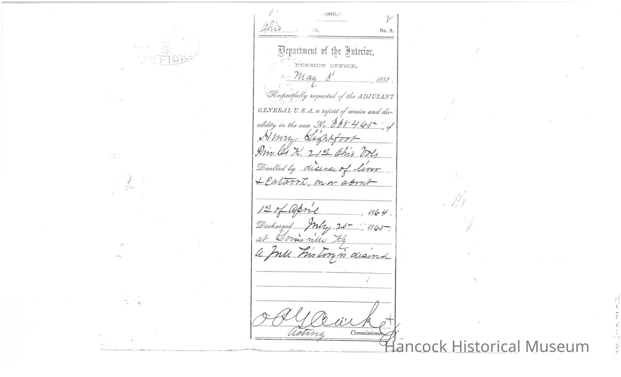 The image is a reproduced document from the Department of the Interior, Pension Office, dated May 8, 1881. It concerns Henry Lightfoot, who was part of Company K of the 21st Ohio Infantry Division. It requests a report of service and disability for his case file number 284.460. The document notes that he was discharged due to illness caused by disease of the liver and chronic rheumatism. His enlistment began on April 1, 1864, and he was discharged on July 28, 1865, in Somerset, Kentucky, due to his disability caused by the described health conditions. The document is signed by a Commissioner and includes various handwritten notes and official stamps.