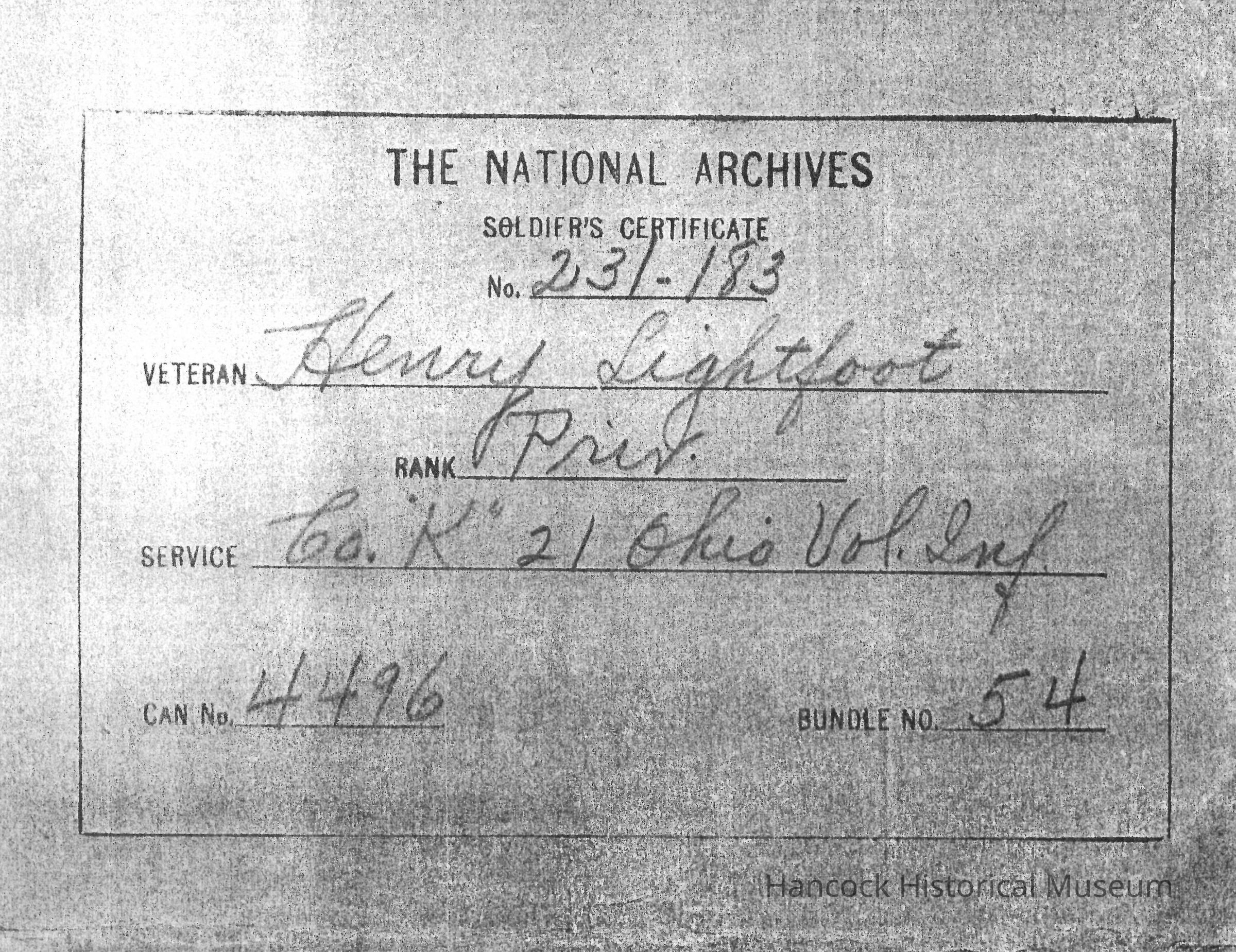 The image shows a soldier's certificate from The National Archives, labeled with the number 23-193. It records details of a veteran named Henry Lightfoot, who held the rank of Private. His service was with Company K of the 21st Ohio Volunteer Infantry. Additionally, the bottom of the certificate notes a Can Number, 4496, and a Bundle Number, 54. The document appears to be historical, possibly related to military records or genealogy research, and is presented with a typewritten and handwritten format, providing key information about the individual's military service during a period when such records were manually documented and archived for historical reference or verification purposes.