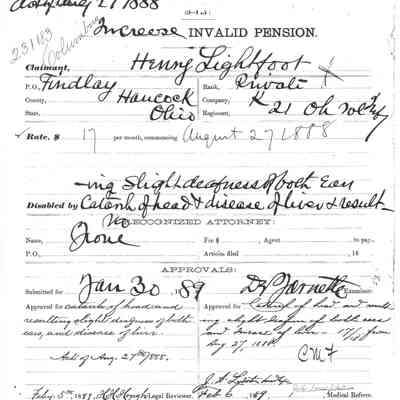 The image shows a historical document titled "Invalid Increase" pertaining to an individual named Henry Lightfoot. He is identified as the applicant, listed under Company K, with an association to the 21st Regiment of Ohio Volunteer Infantry. The document is marked with the number 281.183, indicating a possible reference or file number. It was filed by R. L. Underwood, an attorney based in Toledo, Ohio. The layout is formal, typical of military or legal documentation from historical periods, likely related to a military pension or benefit increase claim. There appears to be a faint seal or stamp near the center of the page, though it is not distinctly visible.