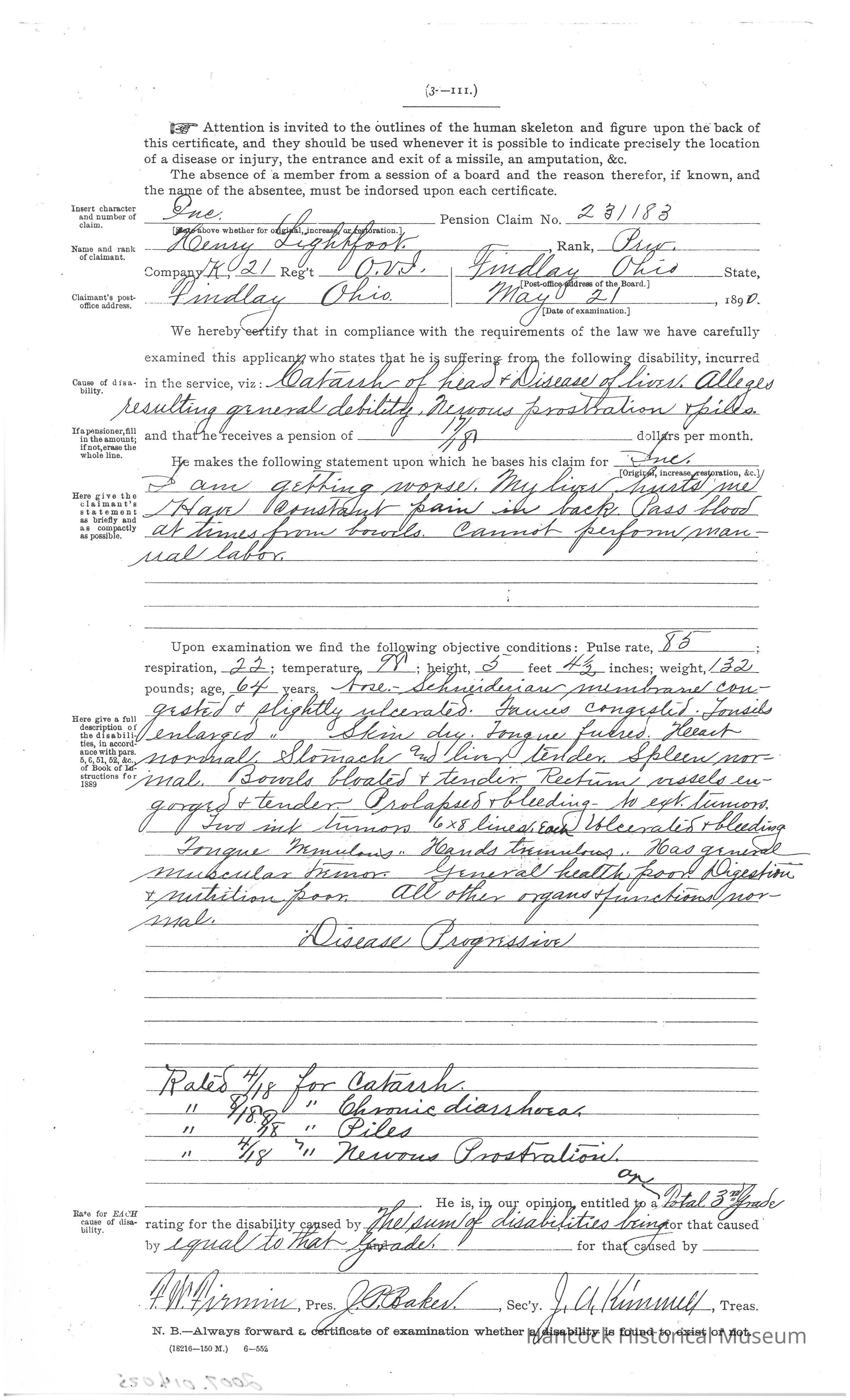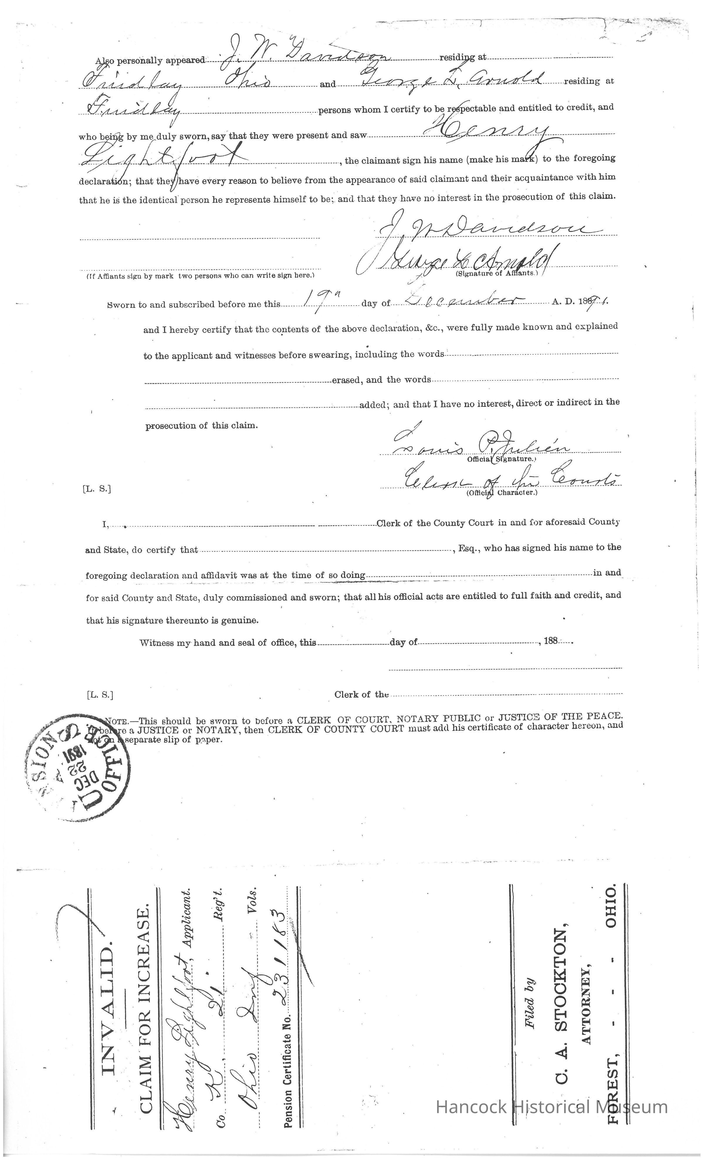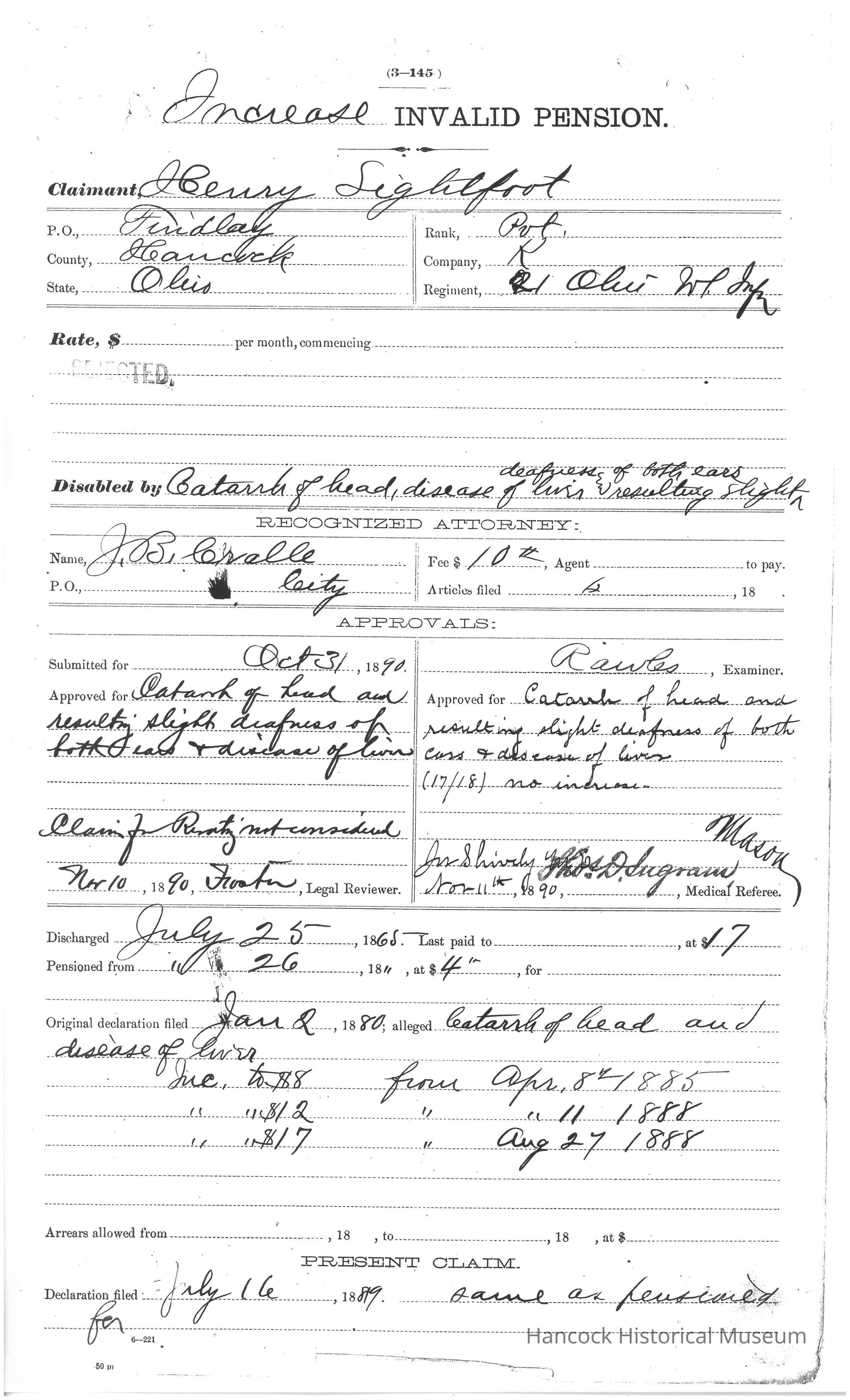 Invalid pennnnsion Increase claim for henry Ligthfoot Civil War pension date Jul 16, 1889.