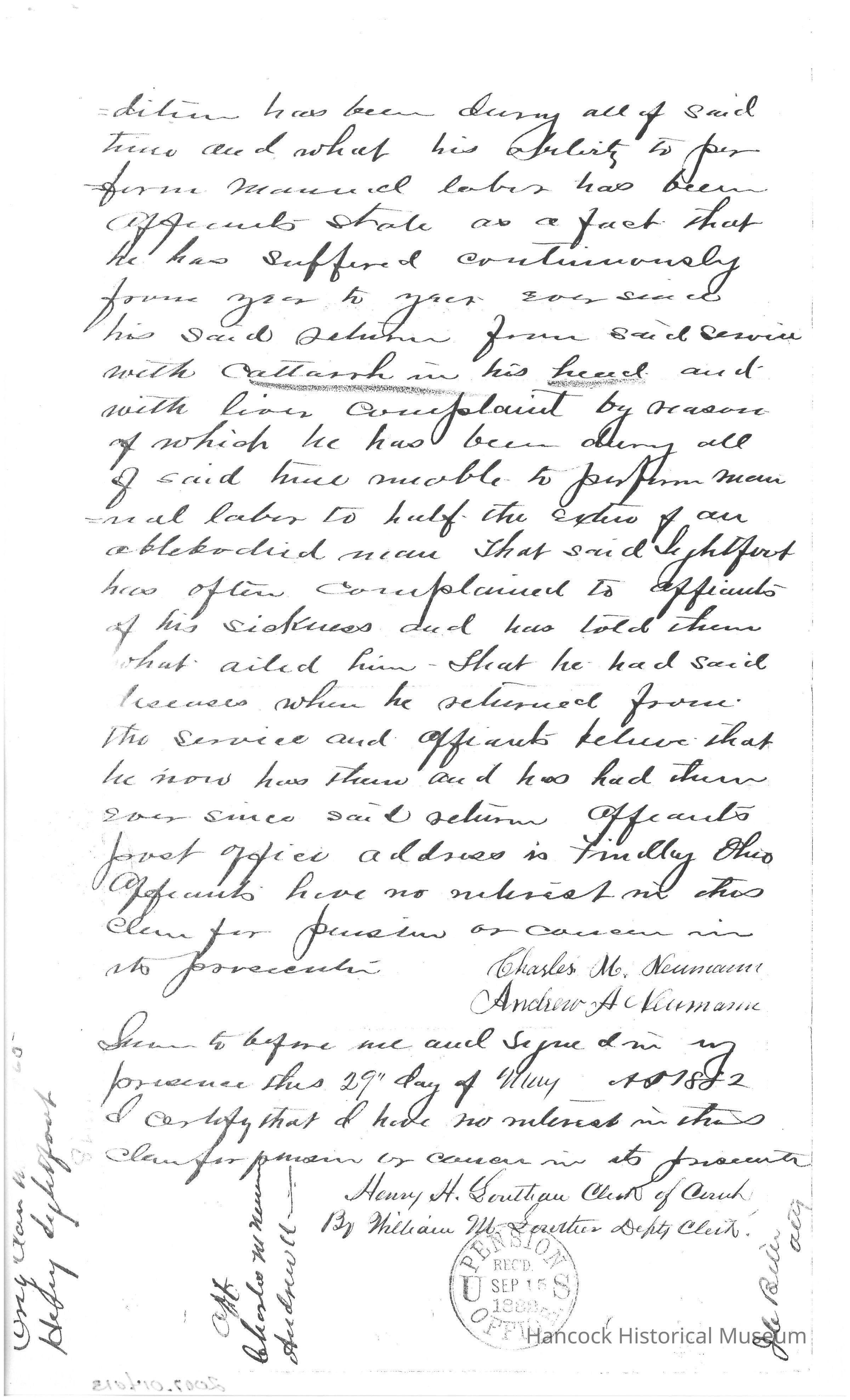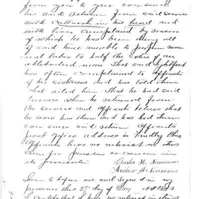 The image is a handwritten document from the state of Ohio, dated May 9, 1882, featuring a testimony given before an authority about Henry Lightfoot of Company K, 21st Regiment, Ohio Volunteer Infantry. It includes statements from individuals who affirm their good character and credibility, and they attest to knowing Henry Lightfoot since his return from military service. The text details their familiarity with Lightfoot's life post-service, noting that they lived in the same community and had consistent interactions with him. The document serves as an affidavit, emphasizing their observance of Lightfoot’s daily activities since 1865, thereby corroborating his experiences and character.