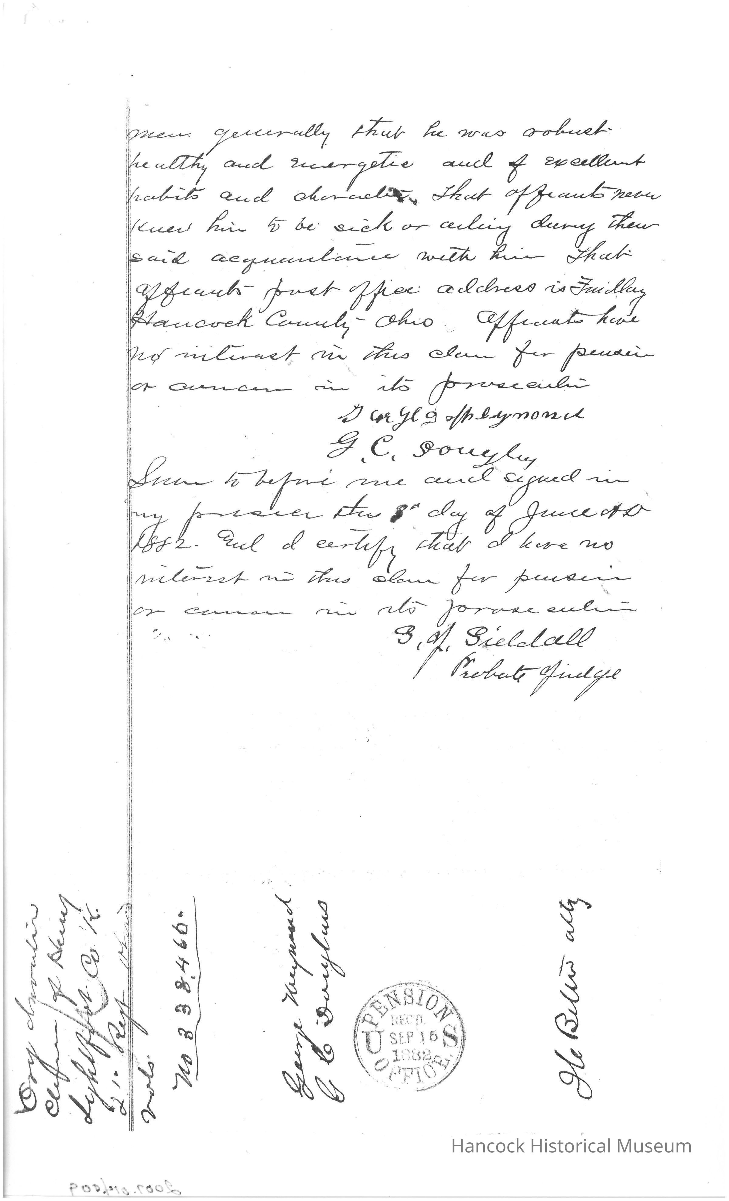 The image is a historical document or affidavit from Hancock County, Ohio, dated June 21, 1882, concerning Henry Lightfoot of Company K, 21st Regiment Ohio Volunteer Infantry. The handwritten text is a testimony by two individuals, George D. Weymond and G. L. Douglas, who verify the character and physical condition of Henry Lightfoot prior to and during his military service, which began in the fall of 1861. They affirm that Lightfoot was known to them as a man of good reputation and in sound health, free from any physical ailments, and capable of performing labor equivalent to an able-bodied individual.