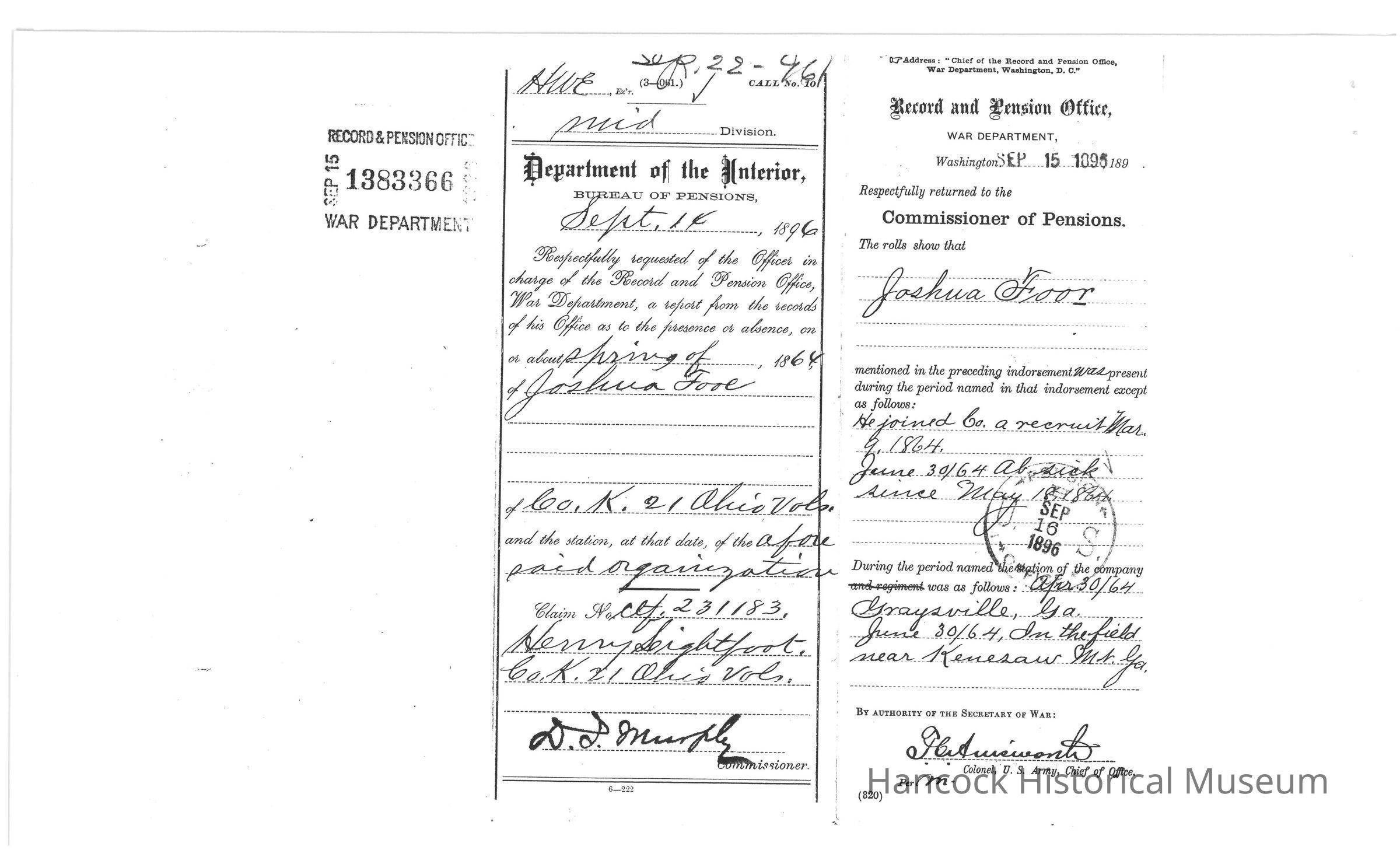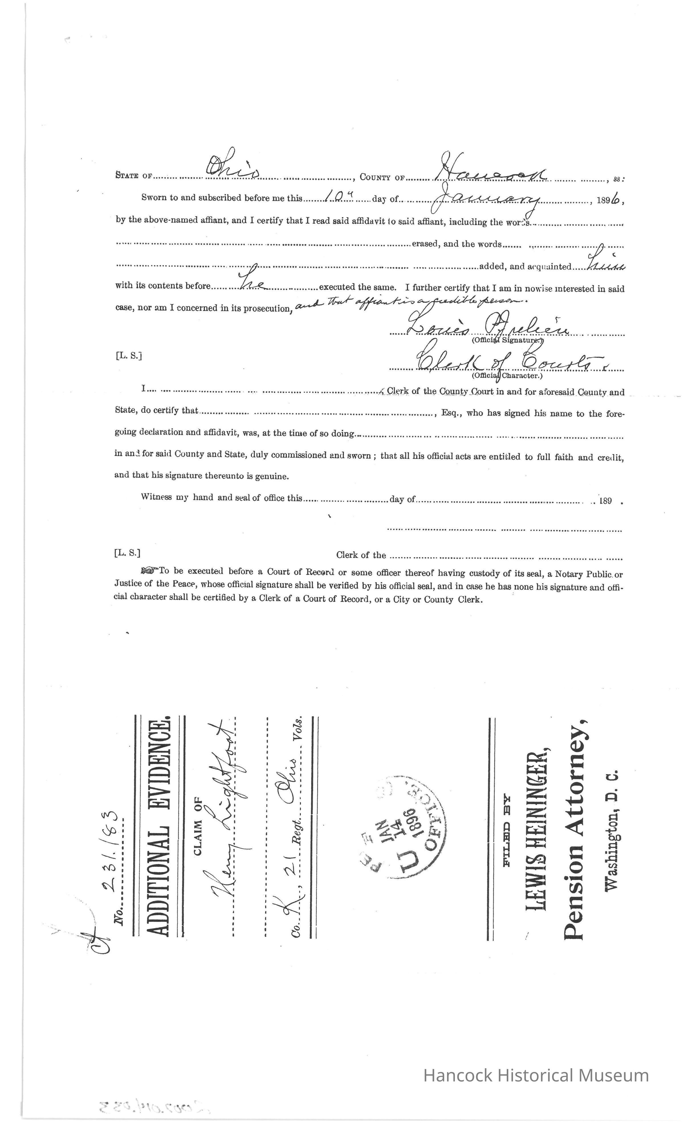 Bureau of Pensions records of Henry Lightfoot Civil War Pension for the year 1896.