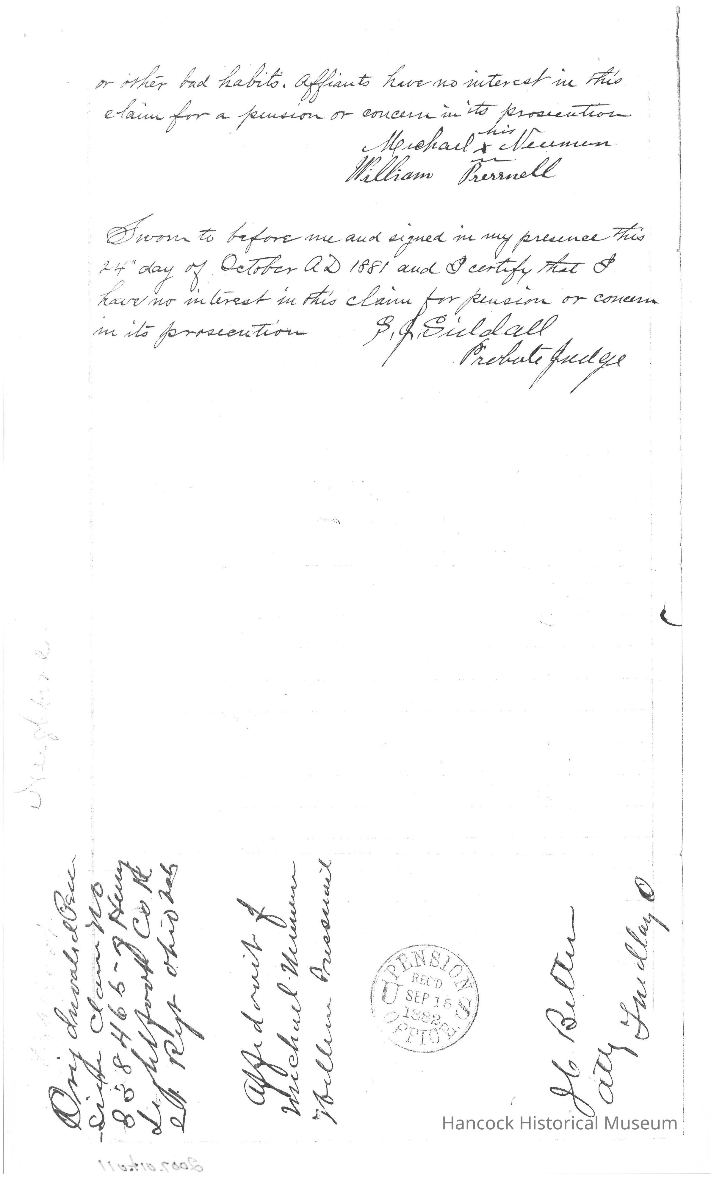 The image depicts a historical document from the state of Ohio, specifically Hancock County, dated October 24, 1881. The document appears to be a sworn statement by two individuals, Michael Neuman and William Pressnell, affirming their acquaintance with Henry Lightfoot, a former member of Company K in the 21st Ohio Volunteer Infantry (OVI). It details Lightfoot's return from military service in July 1865 and discusses his medical condition, noting he suffered from inflammation of the liver and catarrh of the head, affecting his ability to perform manual labor as a result. The document further attests to Lightfoot’s good character and habits, emphasizing that his ailments were not exacerbated by intemperance, suggesting his continued affliction beyond his military service. The document bears an embossed seal, adding an official aspect to its content.