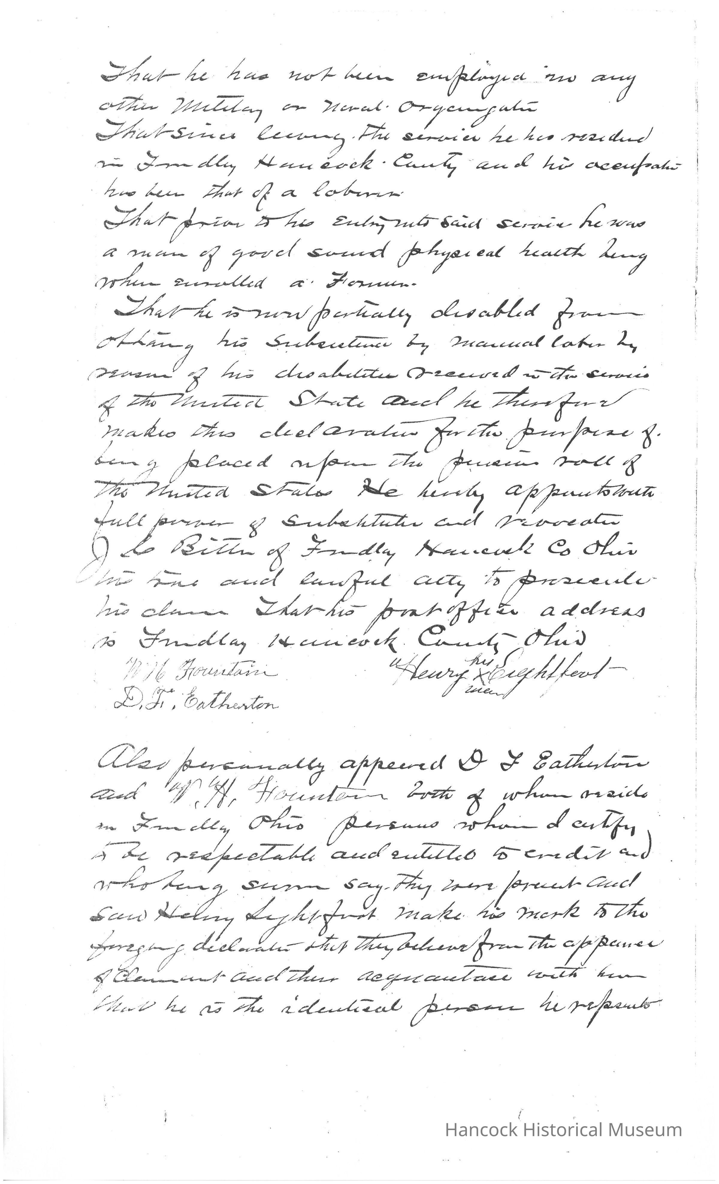The image is a handwritten document from Hancock County, Ohio, dated December 29, 1879. It is a sworn statement given by Henry Lightfoot, aged 63, who is identified as having served in Company K of the 21st Regiment of the Ohio Volunteer Infantry (OVI) during the Civil War. The document details that he enlisted on December 9, 1863, and was honorably discharged on July 20, 1865, in Louisville, Kentucky. Furthermore, it provides a physical description of Lightfoot, stating he was 5 feet 6 inches tall, with a light complexion and sandy hair. It also notes that during his service, he contracted inflammation of the liver and catarrh, likely due to exposure and hardships.