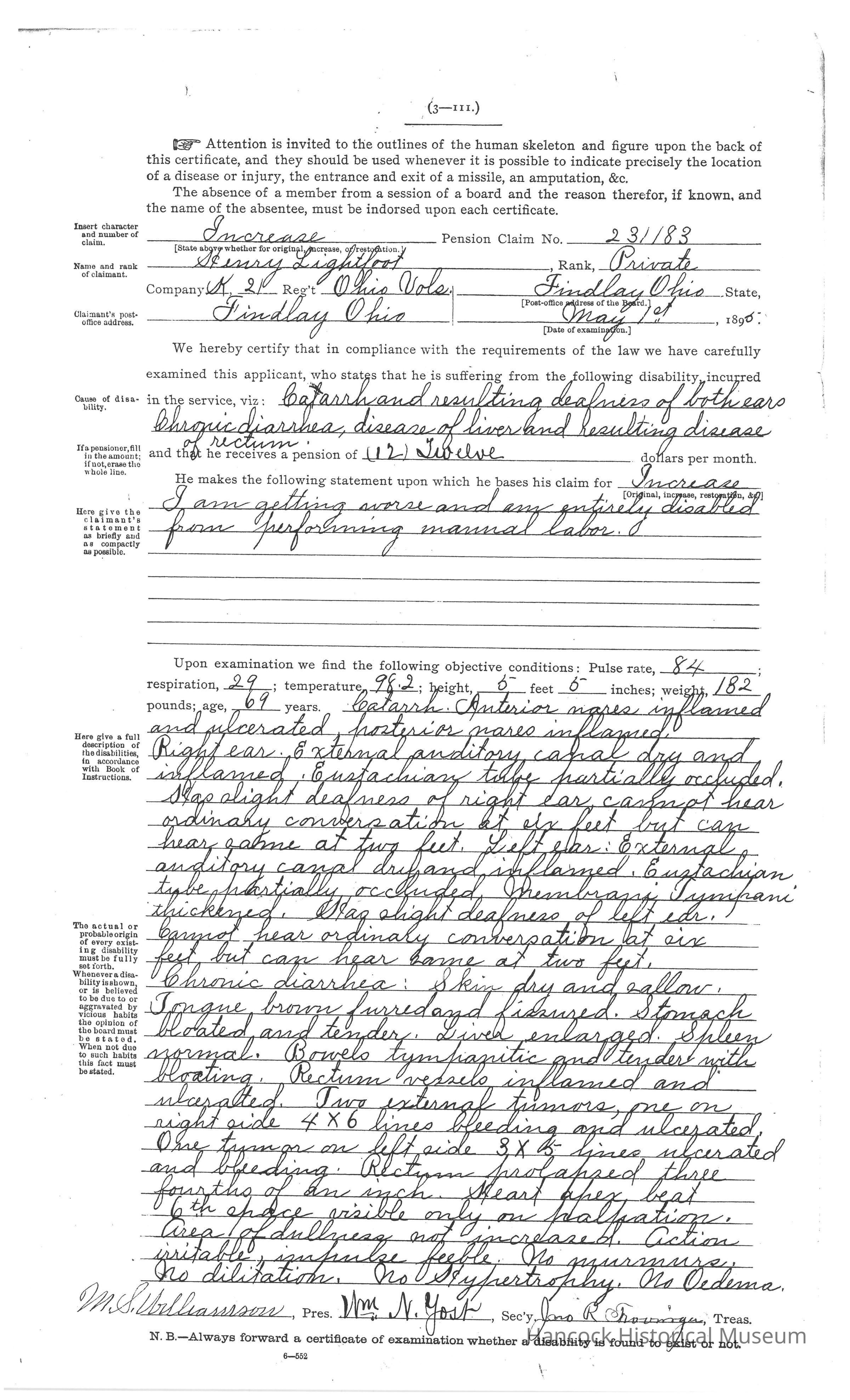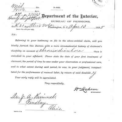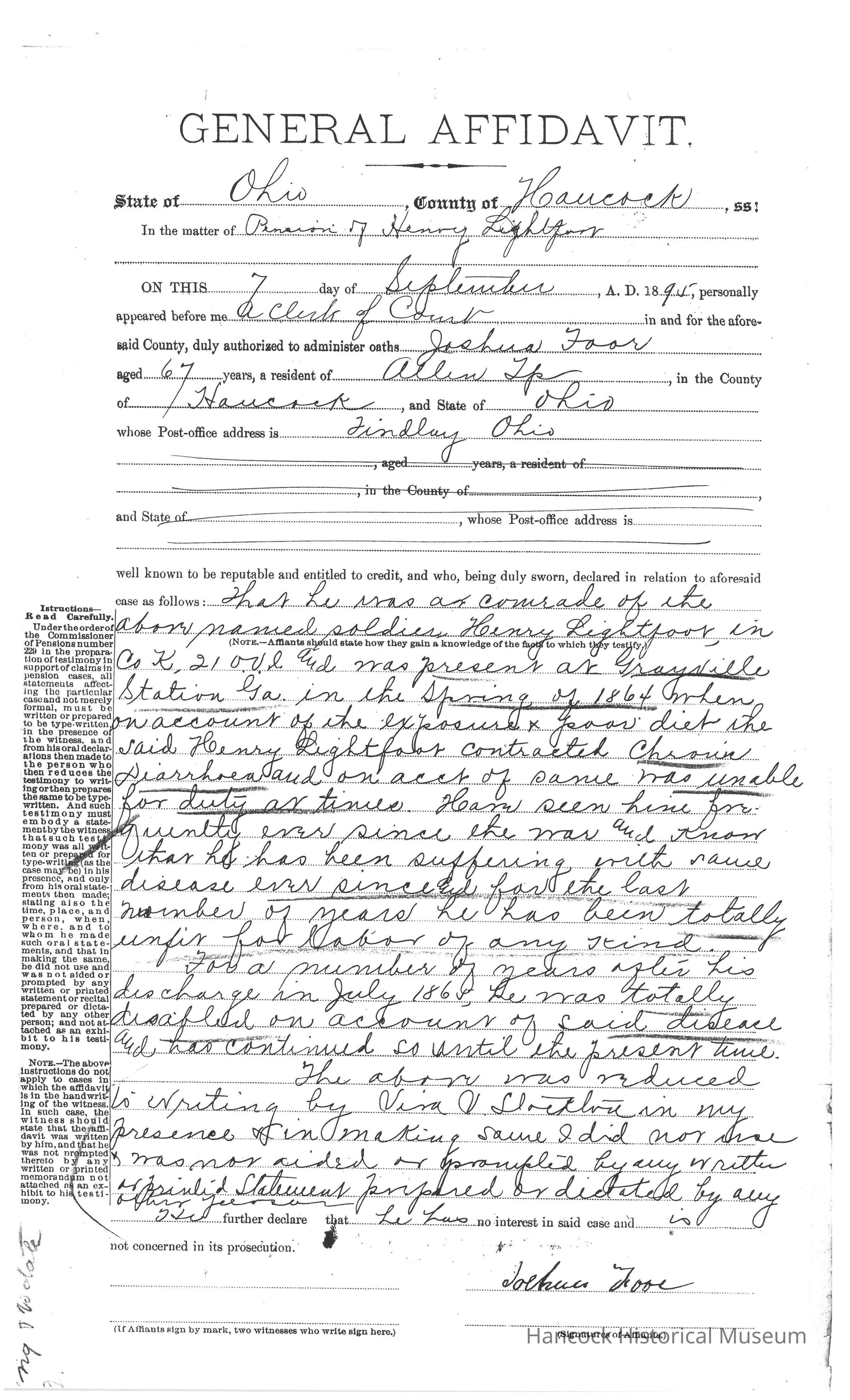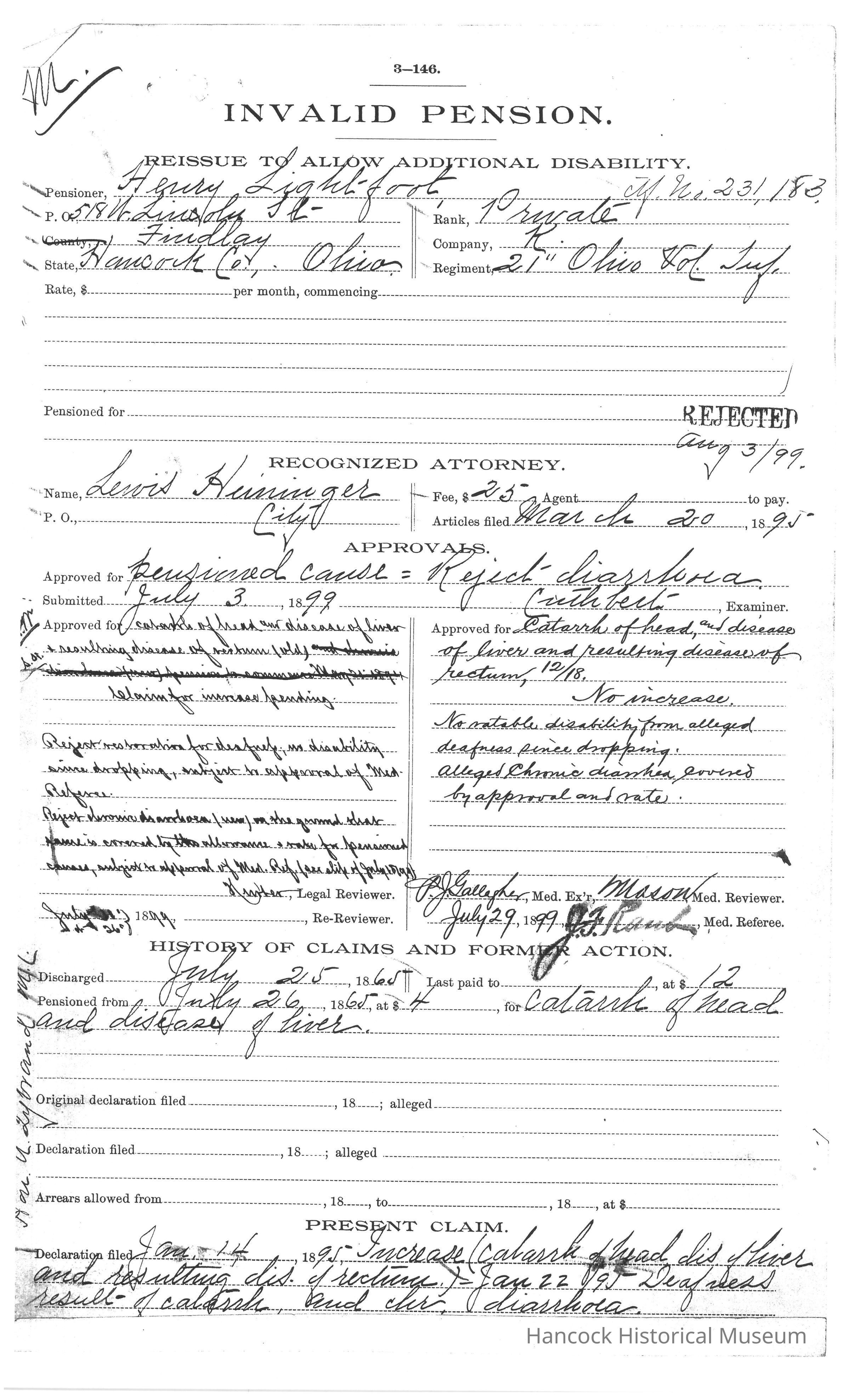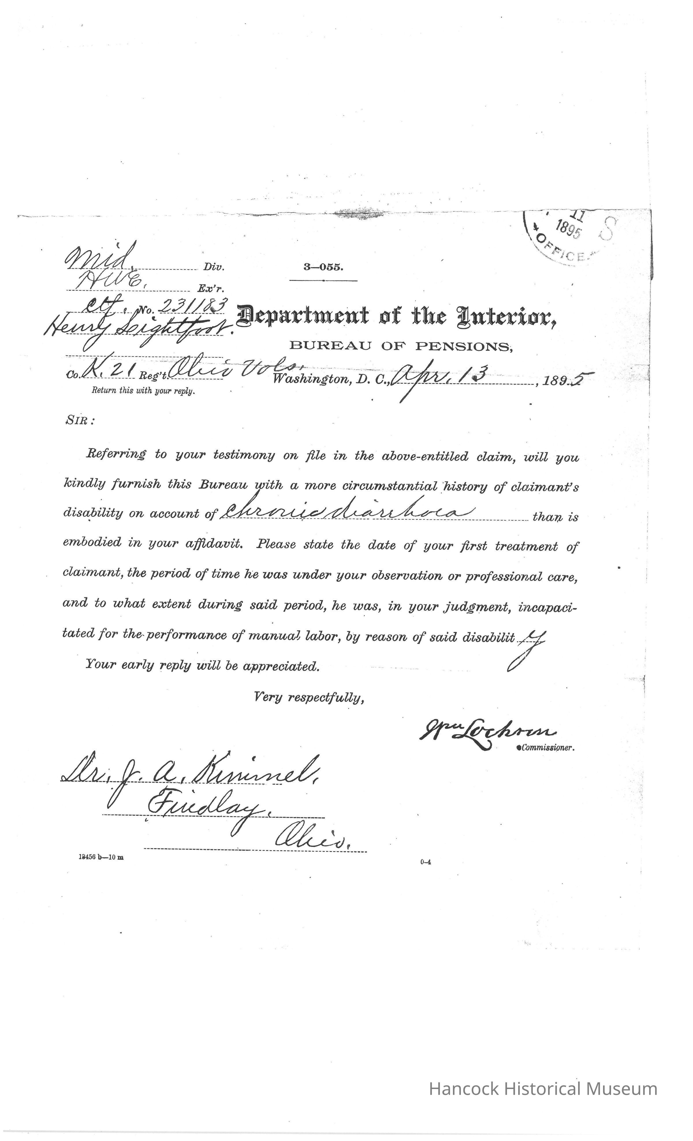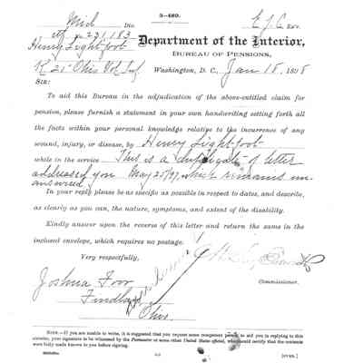 Bureau of Pensions records for Henry Lightfoot Civil War Pension Records for year of 1895.