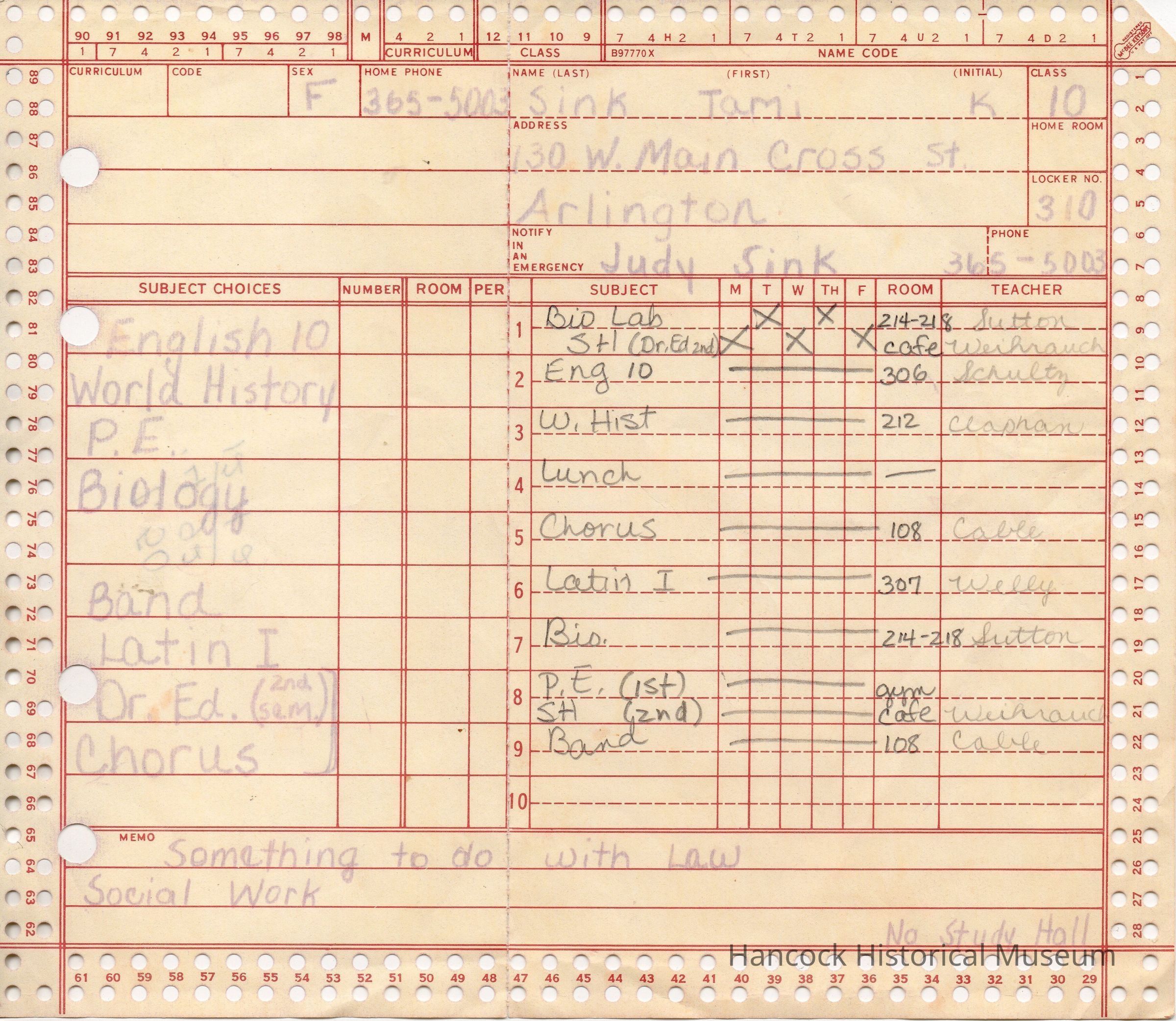 High School Program Card for Tami Sink, Grade 10Entry/Object ID