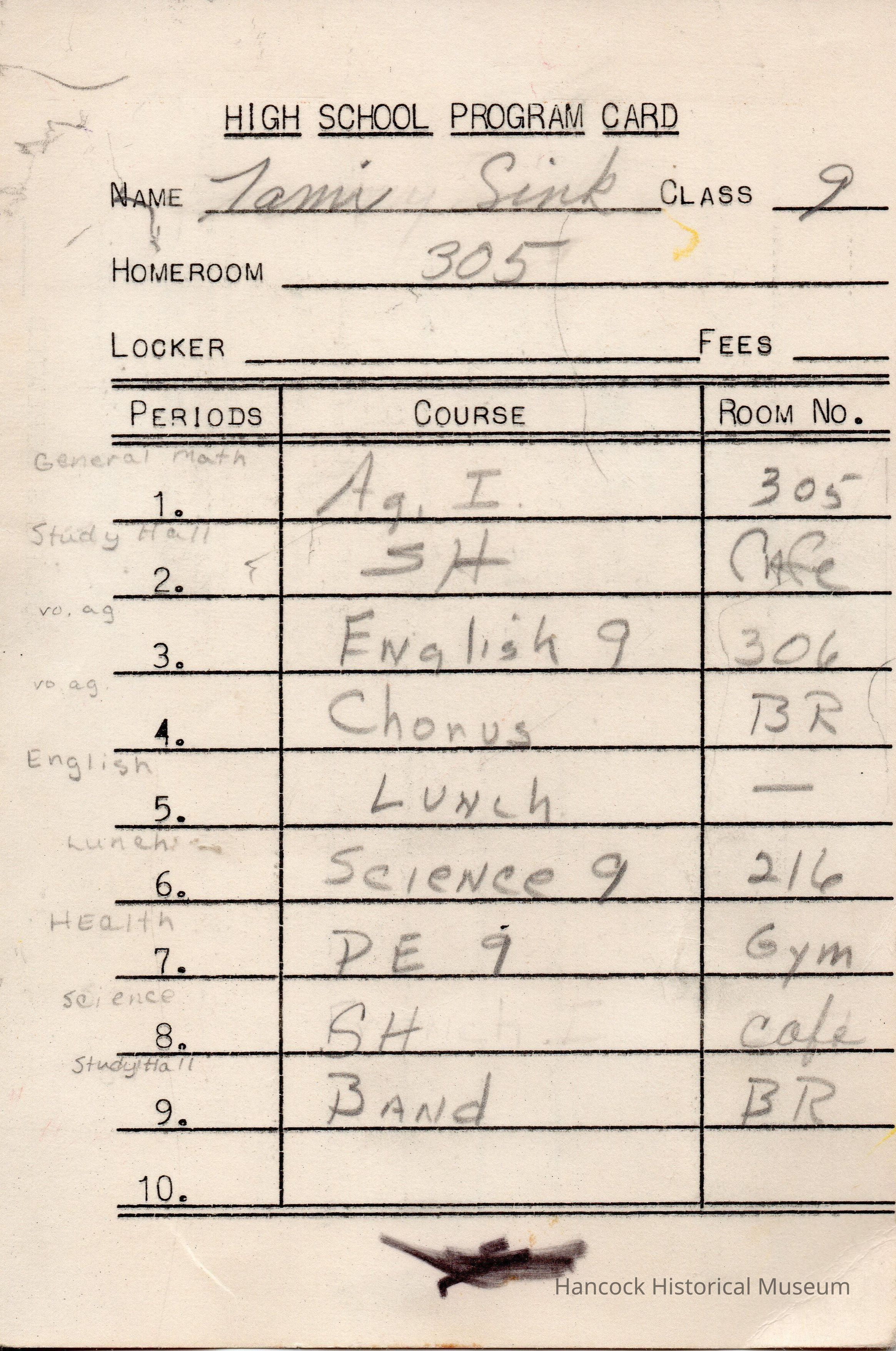 High School Program Card for Tami Sink, Grade 9Entry/Object ID