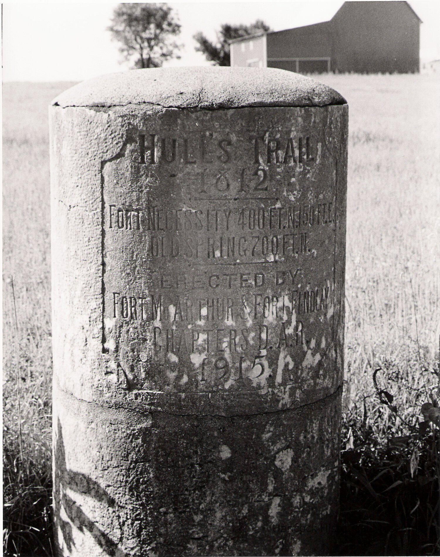 b/w 8 x 10 photo of the marker placed by Fort Mc Arthur & Fort Findlay Chapter DAR in 1915. Marker reads 'Hull's Trail 1812 Fort Necessity 400 ft N 150 ft E Old Spring 700 feet. Erected by Fort Mc Arthur & Fort Findlay Chapter DAR 1915'. Marker is round concrete in a field. In background is a 3 story barn w gabled roof and an addition on L 2 story w/sloping roof.Photograph Details