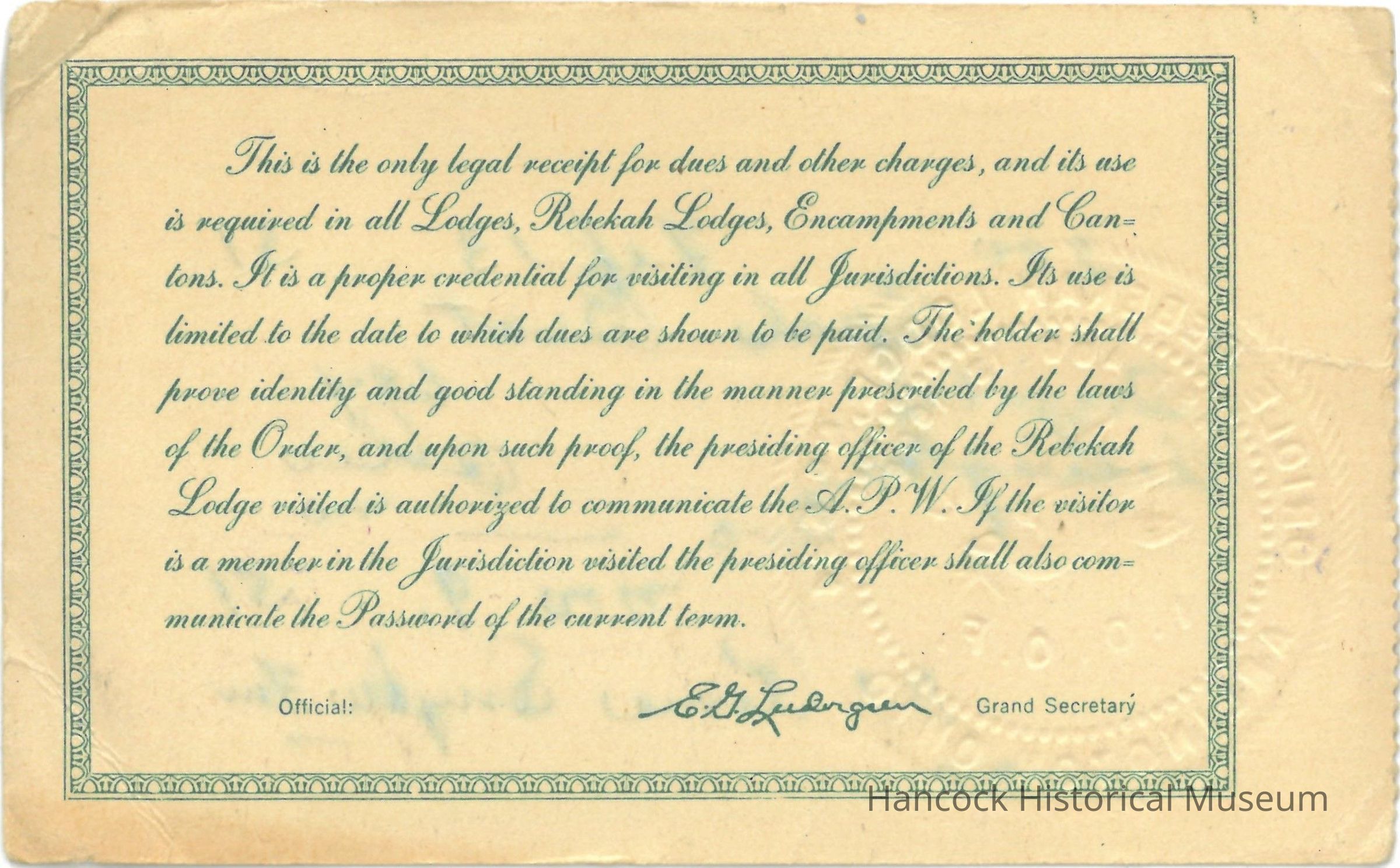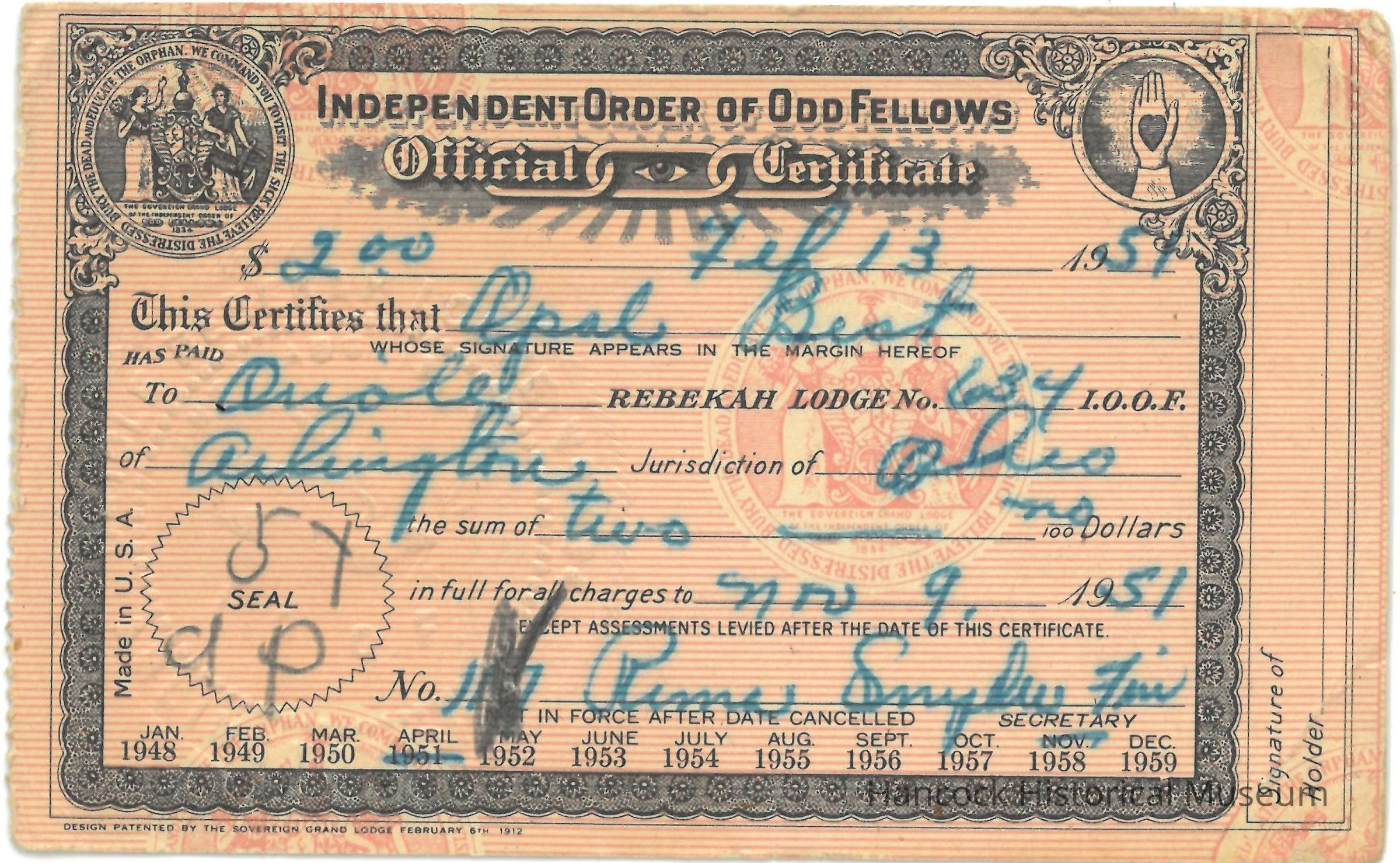 Membership card for Opal Best as a member of the IOOF (Independent Order of Oddfellows) Rebekah Lodge of Arlington February 13, 1951