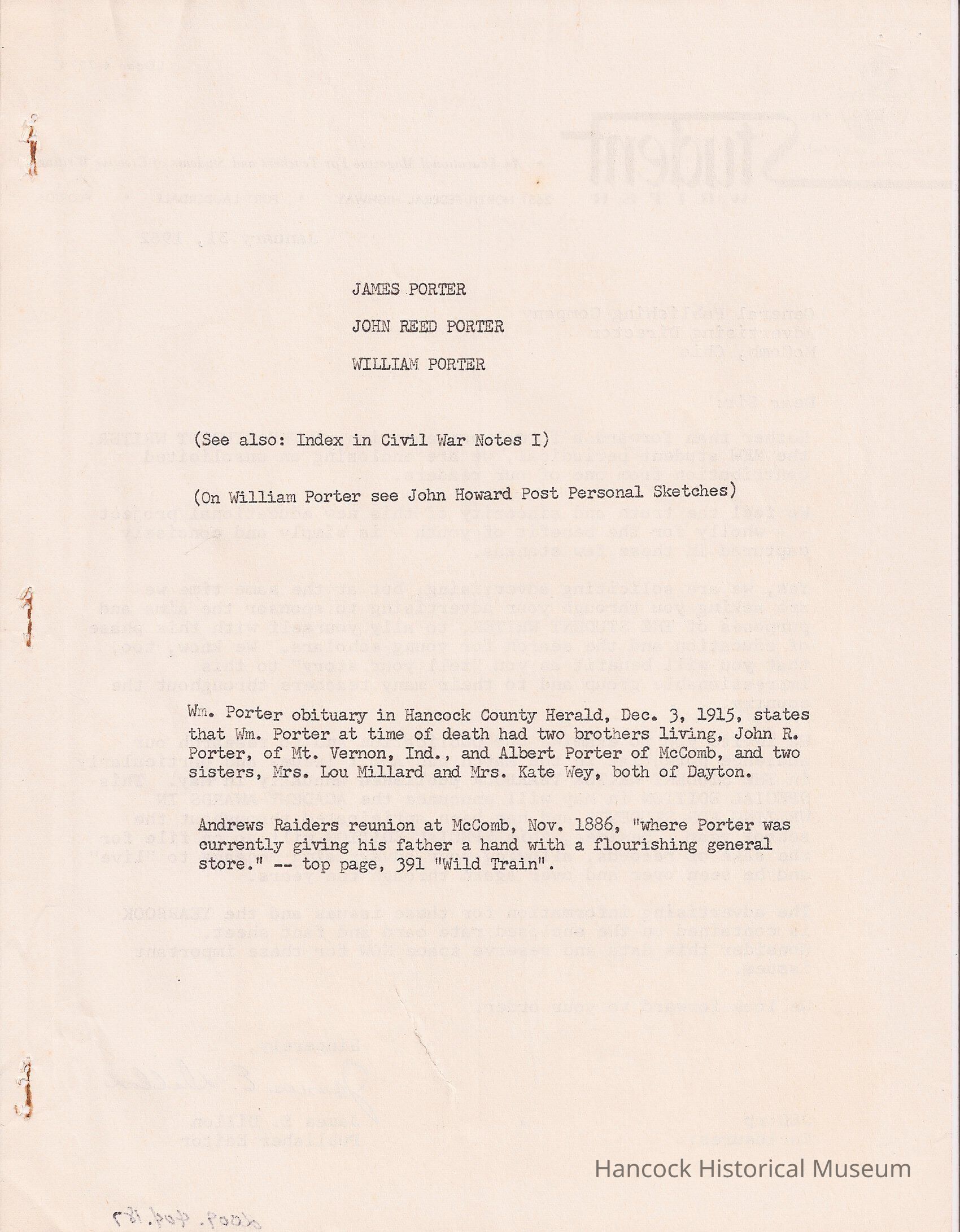 Notes on James Porter, John Reed Porter & William Porter.
