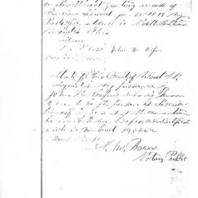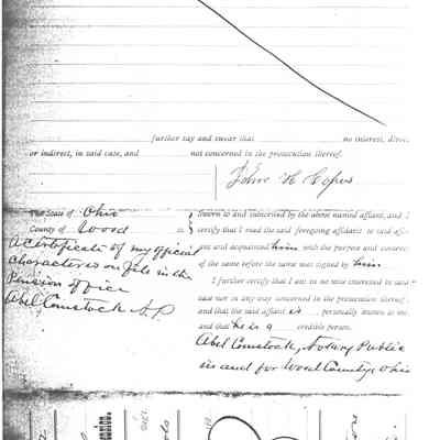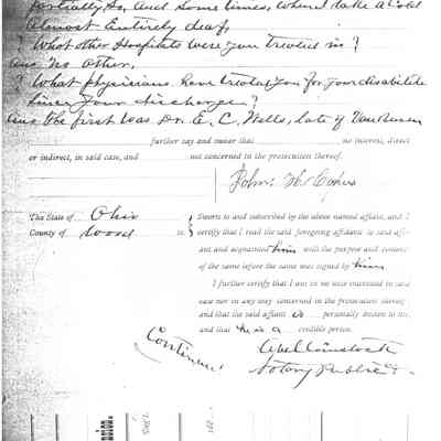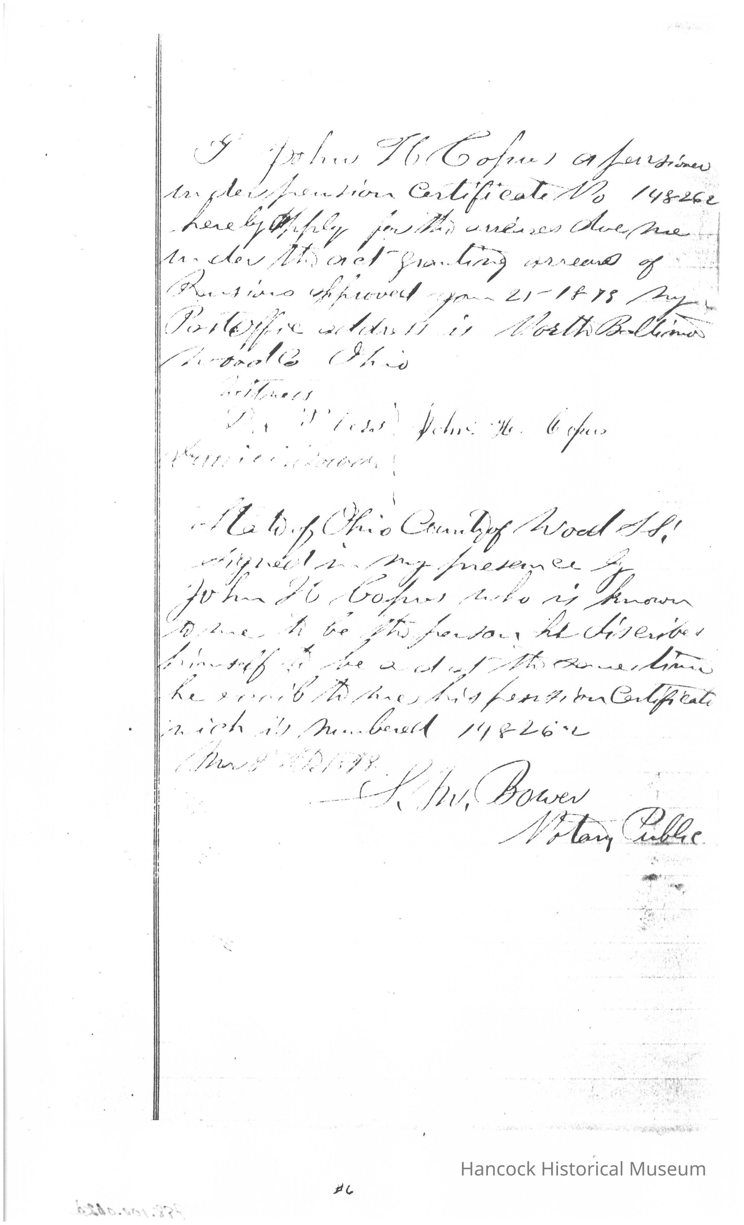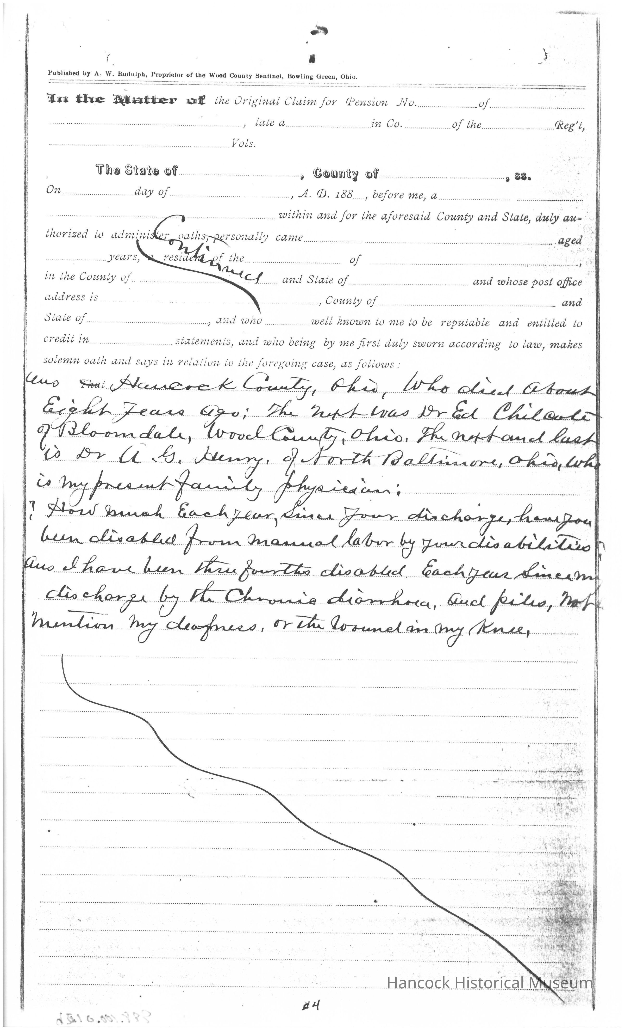 The image is a scanned document from 1884 related to a pension claim for a person named John H. Copus, detailing his military service. It’s set in Wood County, Ohio, and includes handwritten answers to questions about his personal details and medical condition. Copus, a farmer from North Baltimore, Ohio, describes his physical health before and after his military enlistment in 1861, stating he was "sound and able-bodied." He reports no history of chronic diarrhea, piles, or deafness prior to his enlistment but states he contracted such disabilities during service at Hazel Green, KY, in October 1861. The document is signed by Harry Plathen, suggesting official verification.