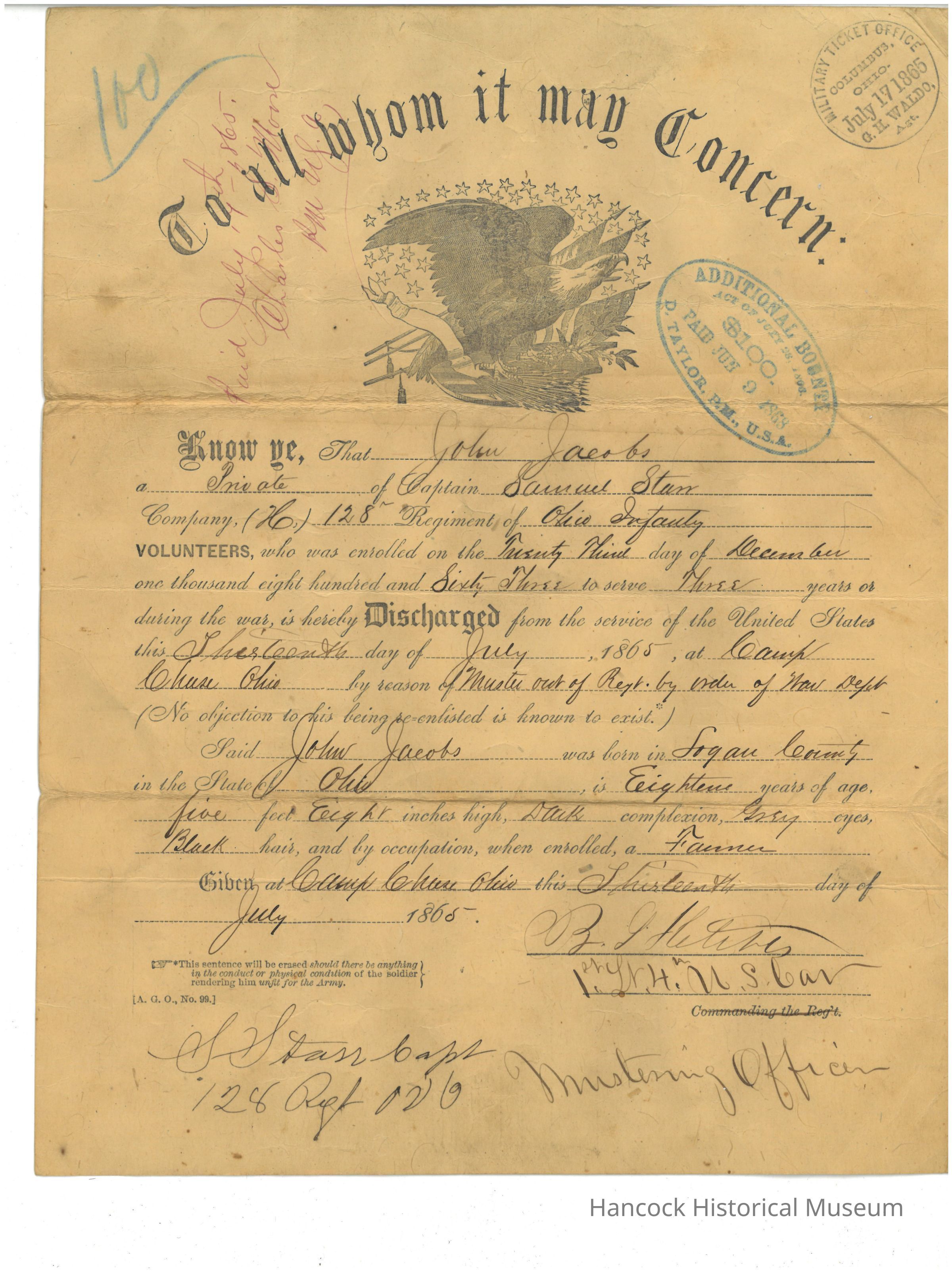 Discharge paper of John jacobs from 128th OVI dated Dec 23, 1863.