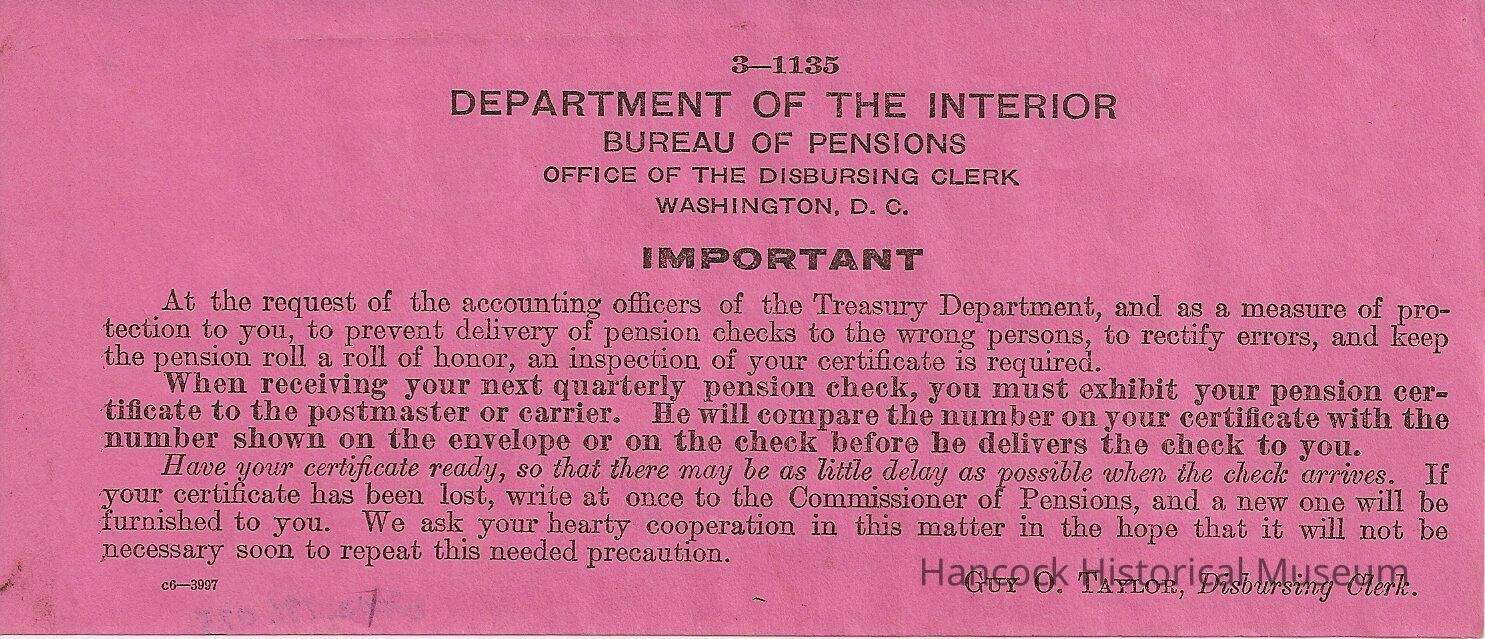 The image is a notice from the Department of the Interior, Bureau of Pensions, Office of the Disbursing Clerk in Washington, D.C. It is printed on pink paper with an emphasis on the importance of the message. The text advises pension recipients to present their pension certificate to the postmaster or carrier upon receiving their quarterly pension check. This is to ensure that the certificate number matches the number on the envelope or check to prevent misdelivery. Recipients are urged to have their certificate ready to avoid delays. If the certificate is lost, they should write to the Commissioner of Pensions for a replacement. The notice is signed by Guy O. Taylor, Disbursing Clerk, and emphasizes cooperation for efficiency.