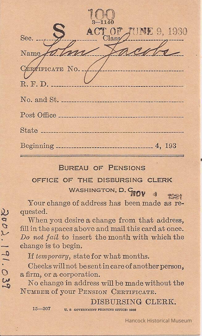 Postcard to John Jacobs, Van Buren, Oh from Bureau of Pensions changing mailing address dated Nov 4, 1921.Collection