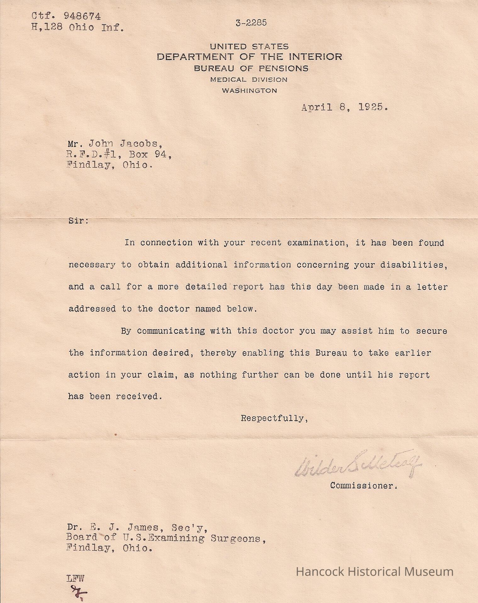 The image shows an official letter dated April 8, 1925, from the Bureau of Pensions, Medical Division, under the United States Department of the Interior in Washington. It is addressed to Mr. John Jacobs in Findlay, Ohio. The letter states the need for additional information regarding Jacobs's disabilities following a recent examination. A detailed report has been requested from a doctor, and Jacobs is encouraged to communicate with this doctor to expedite the process. The letter is signed by a commissioner and also mentions Dr. E. J. James, the Secretary of the Board of U.S. Examining Surgeons based in Findlay, Ohio.