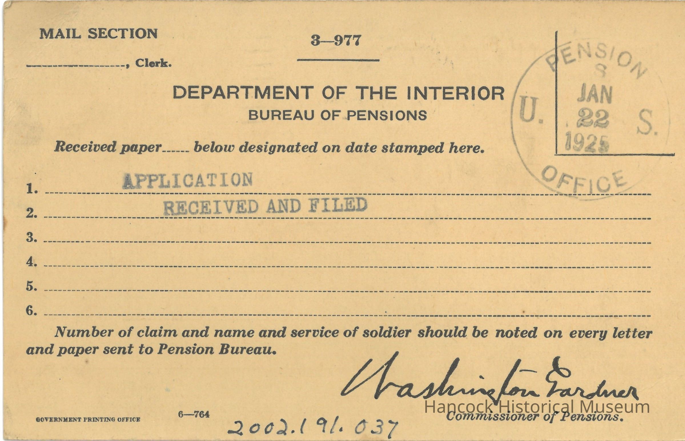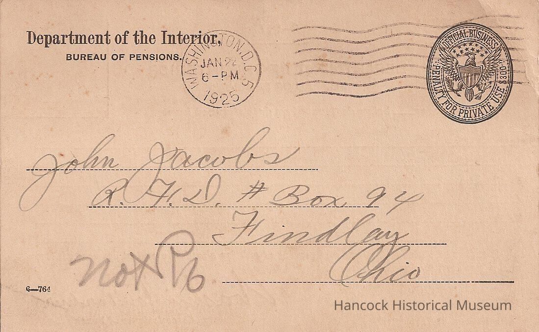 Postcard from Bureau of Pensions to John Jacobs, Box 94, Findlay, Oh postmarked Washington, DC Jan 22, 1925.Collection