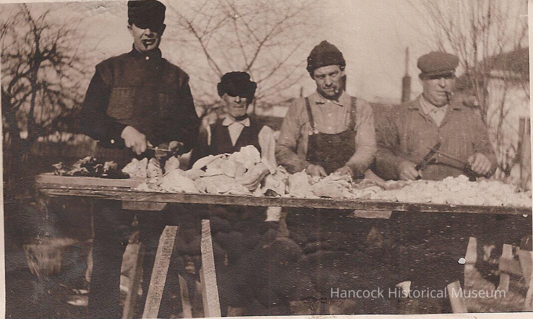 4 x 6 b/w photo of George Beltz & John Schirmer cutting up meat w/two unidentified men outdoors.