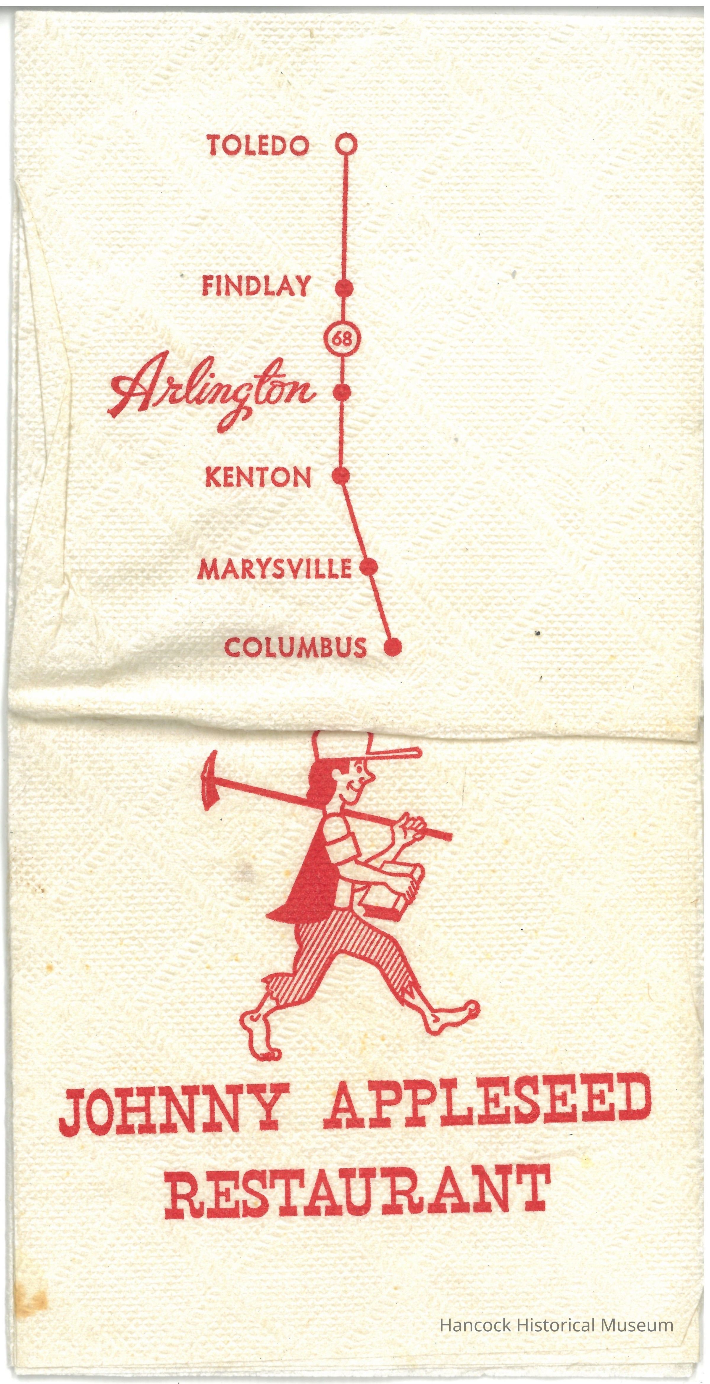 White paper napkin from Johnny Appleseed Restaurant Arlington, Ohio