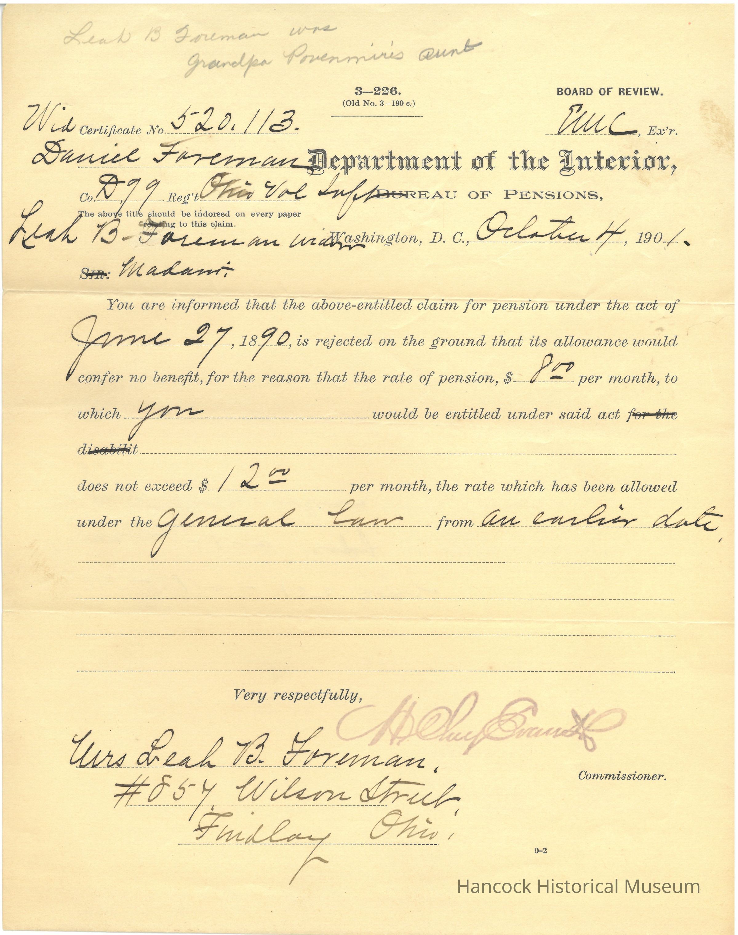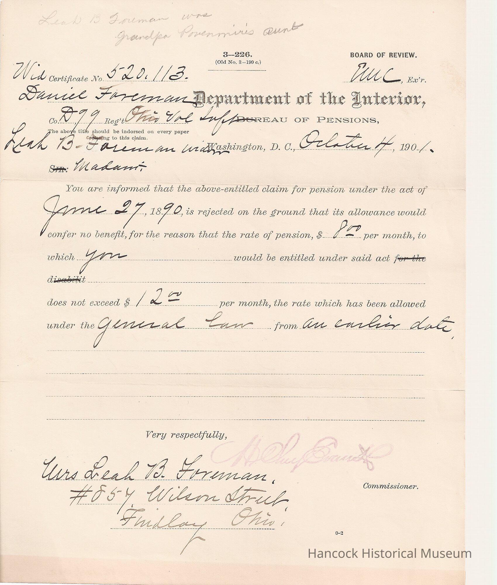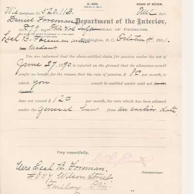 Letter from Bureau of pensions to Leah B Foreman regarding her widow pension dated Oct 4, 1901.