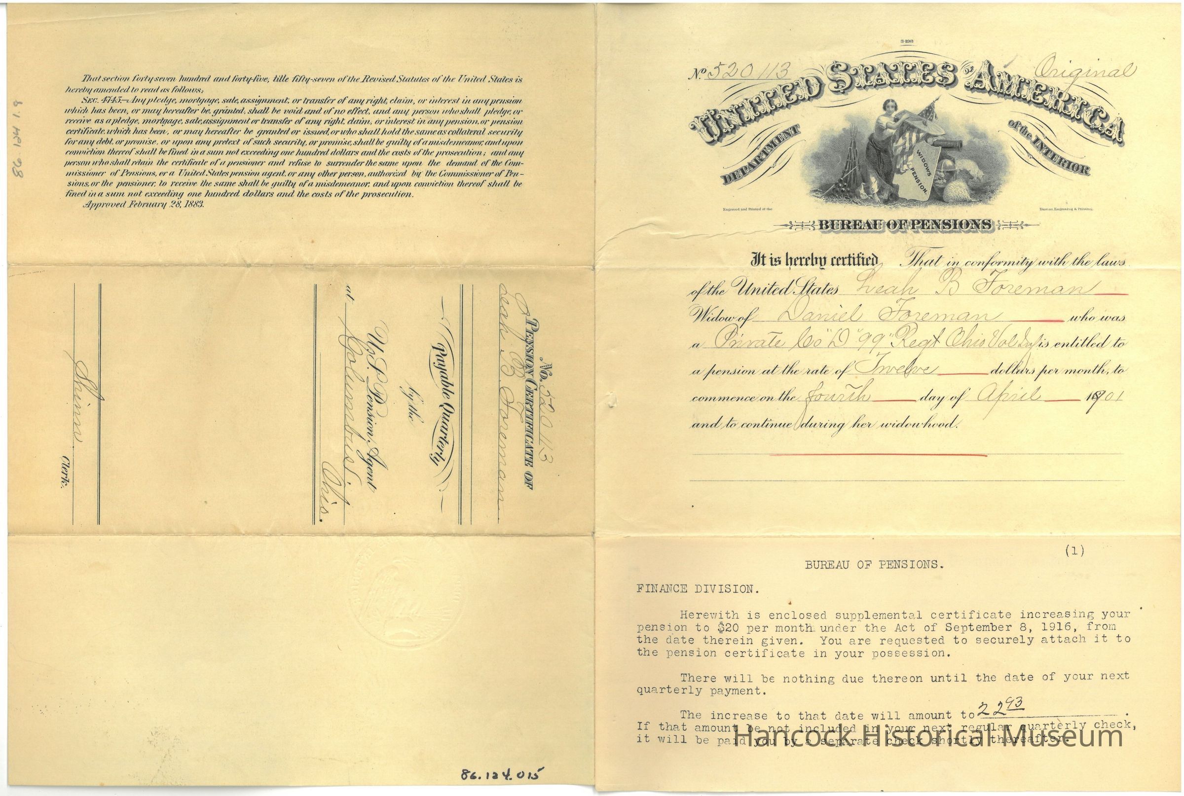 Certificate granting pension of Leah B Foreman widow of Daniel Foreman from Bureau of pensions #529113 dated Apr 4, 1901.Collection